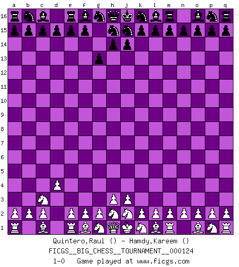 Last move : 1-0 2020 August 19 1:6:57 [Event "FICGS__BIG_CHESS__TOURNAMENT__000124"] [Site "FICGS"] [Date "2020.07.17"] [Round "1"] [White "Quintero,Raul"] [Black "Hamdy,Kareem"] [Result "1-0"] [WhiteElo ""] [BlackElo ""] 1.b1-c3 g15-g13 2.d2-d4 1-0 This big chess game has been lost on time (started : 2020.07.17 9:36:30) Follow this game move after move (download)Fischer prefers to enter Chess history alone. (Miguel Najdorf) Ich rechne überhaupt nicht voraus. Ich gewinne auch so. (Robert James Fischer) El Ajedrez es un terrible juego. Si no controlas el centro, tu oponente tiene una posición mas holgada. Si tienes control del centro, ¡entonces realmente tu tienes algo de que preocuparte!. (Siegbert Tarrasch) L'action d'une oeuvre littéraire se déroule sur un champ de bataille. Les masques et les types du drame moderne correspondent aux pièces du jeu d'échecs. L'intrigue correspond aux coups et aux gambits, c'est à dire aux techniques du jeu telles qu'utilisées et interprétées par les joueurs. Les tactiques et les péripéties [mouvements] correspondent aux coups exécutés par l'adversaire. (Viktor Shklovsky) The beginning of wisdom is silence. The second step is listening. (Unknown)