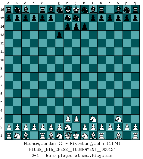 Last move : 0-1 2020 August 19 13:6:43 [Event "FICGS__BIG_CHESS__TOURNAMENT__000124"] [Site "FICGS"] [Date "2020.07.17"] [Round "1"] [White "Michow,Jordan"] [Black "Rivenburg,John"] [Result "0-1"] [WhiteElo ""] [BlackElo "1174"] 1.j2-l3 g15-g13 2.p1-o3 k15-k14 0-1 This big chess game has been lost on time (started : 2020.07.17 9:36:30) Follow this game move after move (download)What would Chess be without silly mistakes ? (Kurt Richter) Es hat in meinem Leben Zeiten gegeben, da ich sehr nahe daran war zu glauben, daß ich auch nicht eine einzige Schachpartie verlieren könnte. (José Raúl Capablanca) Yo adoro todas la posiciones. Denme una partida posicional difícil, y la jugaré. Pero posiciones totalmente ganadas, no las tolero. (Hein Donner) Vous n'êtes pas toujours obligé de jouer le meilleur coup. Un coup doit être actif, entreprenant, correct et beau ! (David Bronstein) Now the reason the enlightened prince and the wise general conquer the enemy whenever they move and their achievements surpass those of ordinary men is foreknowledge. (Sun Tzu)
