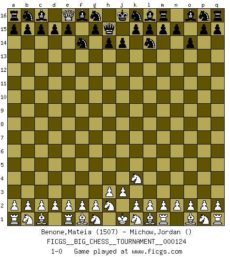 Last move : 1-0 2020 August 22 1:47:40 [Event "FICGS__BIG_CHESS__TOURNAMENT__000124"] [Site "FICGS"] [Date "2020.07.17"] [Round "1"] [White "Benone,Mateia"] [Black "Michow,Jordan"] [Result "1-0"] [WhiteElo "1507"] [BlackElo ""] 1.j2-k4 j15-l14 2.h1-o7 o15-o14 3.o7-f15 h15-f14 4.f15-g14 h16-h15 5.g14-e16 1-0 This big chess game has been lost on time (started : 2020.07.17 9:36:30) Follow this game move after move (download)When you are lonely, when you feel yourself an alien in the world, play Chess. This will raise your spirits and be your counselor in war. (Aristotle) Gegen einen Schachcomputer zu verlieren ist wie Löcher in den Strümpfen zuhaben. Es ist nicht peinlich, solange man der einzige ist der es weiß. (Anonymous) Debemos de asegurarnos de que el Ajedrez no se convierta en un lenguaje muerto, muy interesante, pero tan solo para un grupo muy pequeño. (Sytze Faber) Mais n'est-ce pas déjà le limiter injurieusement que d'appeler les échecs un jeu? N'est-ce pas aussi une science, un art, ou quelque chose qui, comme le cercueil de Mahomet entre ciel et terre, est suspendu entre l'un et l'autre, et qui réunit un nombre incroyable de contraires ? (Stefan Zweig) Computers have lots of memory but no imagination. (Anonymous)
