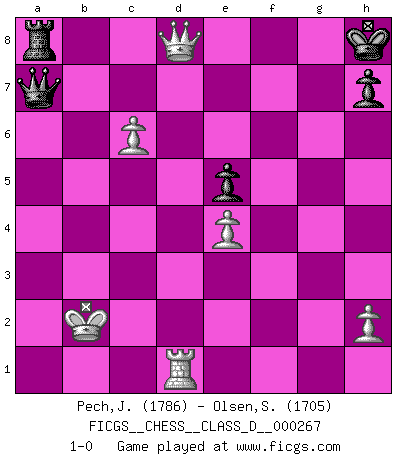Last move : 1-0 2020 December 13 11:43:0 [Event "FICGS__CHESS__CLASS_D__000267"] [Site "FICGS"] [Date "2020.07.17"] [Round "1"] [White "Pech,Jaroslav"] [Black "Olsen,Sverre Eugen"] [Result "1-0"] [WhiteElo "1786"] [BlackElo "1705"] 1.e4 c5 2.Nf3 d6 3.d4 cxd4 4.Nxd4 Nf6 5.Nc3 a6 6.Be3 e5 7.Nb3 Be6 8.f3 Be7 9.Qd2 O-O 10.O-O-O Nbd7 11.g4 b5 12.g5 Nh5 13.Nd5 Bxd5 14.exd5 f5 15.gxf6 Bxf6 16.Na5 Qc7 17.Bd3 Nb6 18.Nc6 Rac8 19.Bf2 Kh8 20.Be4 Nc4 21.Qe2 Bg5+ 22.Kb1 Nf6 23.Rhf1 Nb6 24.Rg1 Bh6 25.Be1 Nc4 26.Bh4 a5 27.b3 Na3+ 28.Kb2 b4 29.c4 Ra8 30.c5 Bf4 31.Bf2 Qd7 32.cxd6 Qxd6 33.Rg2 Rf7 34.Ka1 Rd7 35.Bb6 Rb7 36.Qf2 Nb5 37.Bc5 Qd7 38.Qh4 g5 39.Rxg5 Bxg5 40.Qxg5 Qg7 41.Qd2 Nxe4 42.fxe4 a4 43.bxa4 Rxa4 44.Bxb4 Nd4 45.Rb1 Nxc6 46.dxc6 Rba7 47.a3 Rxa3+ 48.Bxa3 Rxa3+ 49.Kb2 Ra8 50.Rd1 Qa7 51.Qd8+ 1-0 Follow this game move after move (download)Chess is in its essence a game, in its form an art, and in its execution a science. (Baron Tassilo) Ein Schachspiel besteht aus drei Phasen: Die erste, wenn du hofftst den Vorteil zu haben, die zweite, wenn du glaubst einen Vorteil zu haben, und die dritte.... wenn du weißt Du wirst verlieren. (Savielly Grigorievitsch Tartakower) a manera como él juega al Ajedrez, demuestra la completa naturaleza de un hombre. (Stanley Ellin) Je fais ceci parce que dans cinquante coups j'obtiendrai cela; je m'appelle Mikhail Moisevitch Botvinnik. (Botvinnik) Who needs drugs and alcohol if he can play Big Chess at FICGS ? (Heinz-Georg Lehnhoff)