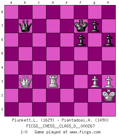 Last move : 1-0 2020 December 2 23:13:54 [Event "FICGS__CHESS__CLASS_D__000267"] [Site "FICGS"] [Date "2020.07.17"] [Round "1"] [White "Plunkett,Louis"] [Black "Piantadosi,Angelo"] [Result "1-0"] [WhiteElo "1629"] [BlackElo "1490"] 1.c4 e5 2.g3 d5 3.cxd5 Qxd5 4.Nf3 Nc6 5.Nc3 Qd8 6.Bg2 Nf6 7.O-O Be7 8.d3 O-O 9.a3 Re8 10.e4 Bg4 11.Be3 Nd4 12.Bxd4 exd4 13.Ne2 c5 14.h3 Bxf3 15.Bxf3 Rc8 16.Rc1 Bd6 17.Bg2 Nd7 18.f4 Bb8 19.e5 b6 20.Be4 f6 21.Qb3+ Kh8 22.e6 Nf8 23.f5 a6 24.Qd1 Nxe6 25.fxe6 Rxe6 26.Bf5 Re3 27.Bxc8 Qxc8 28.Kh2 Qe8 29.Rc2 Qg6 30.Rg1 Rxd3 31.Rd2 Rxd2 32.Qxd2 h6 33.b4 Be5 34.bxc5 bxc5 35.Qa5 Qc2 36.Rg2 Qc4 37.Qd8+ Kh7 38.Qd7 Qd3 39.Nf4 Qxa3 40.Qf5+ Kg8 41.Qe6+ Kh7 42.Qf7 Qa4 43.Qg6+ Kg8 44.Ne6 Qd7 45.Nxc5 Qe7 46.Nxa6 Qf7 47.Qe4 Qc4 48.Qa8+ Kh7 49.Qb7 d3 50.Nb4 Bc3 51.Nd5 d2 52.Qb1+ Kh8 53.Nxc3 Qxc3 54.Qd1 Qe3 55.Rxd2 Kh7 56.Qc2+ Kg8 57.Rd8+ Kf7 58.Rd7+ Ke6 59.Qc6+ Kf5 60.Rd5+ Kg6 61.Qc2+ Kf7 62.Qc7+ Kg6 63.Qc2+ Kf7 64.Rd3 Qb6 65.Qe2 Qb5 66.Qc2 Qb7 67.Qb3+ 1-0 Follow this game move after move (download)No one ever won a game by resigning. (Unknown) Ich bin Weltmeister und muß mit niemandem irgend etwas diskutieren. (Viswanathan Anand) El Ajedrez es un terrible juego. Si no controlas el centro, tu oponente tiene una posición mas holgada. Si tienes control del centro, ¡entonces realmente tu tienes algo de que preocuparte!. (Siegbert Tarrasch) Ce n'est pas pour s'amuser qu'il joue aux échecs : il célèbre un culte. (Vladimir Nabokov) At last I discovered the true beauty of chess. So I proposed to her. (Dinesh De Silva)