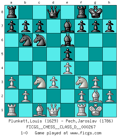 Last move : 1-0 2020 September 7 22:29:19 [Event "FICGS__CHESS__CLASS_D__000267"] [Site "FICGS"] [Date "2020.07.17"] [Round "1"] [White "Plunkett,Louis"] [Black "Pech,Jaroslav"] [Result "1-0"] [WhiteElo "1629"] [BlackElo "1786"] 1.c4 e5 2.g3 Nf6 3.Bg2 d5 4.cxd5 Nxd5 5.Nc3 Nb6 6.Nf3 Nc6 7.O-O Be7 8.a3 O-O 9.d3 Be6 10.e4 1-0 This chess game has been lost on time (started : 2020.07.17 11:59:31) English Opening Kingside Castling by player White (move 7) Kingside Castling by player Black (move 8) Player White won this chess game. Follow this game move after move (download)Look at Garry Kasparov. After he loses, invariably he wins the next game. He just kills the next guy. That's something that we have to learn to be able to do. (Maurice Ashley) Über Kasparov: Es ist offensichtlich, daß er in einem totalitären Staat aufwuchs und deshalb zu diktatorischen Zügen neigt. (Viktor Kortschnoi) El Ajedrez no es como la vida... ¡tiene reglas!. (Mark Pasternak) Si le désir cupide (et stupide) de gagner est une inépuisable source de souffrance, une combinaison brillante sur l'échiquier est une découverte : le coquelicot qui s'épanouit lorsque apparaît la Voie Lactée. (Arrabal) Lottery : A tax on people who are bad at math. (Author unknown)