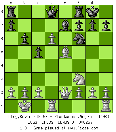 Last move : 1-0 2020 September 4 0:28:29 [Event "FICGS__CHESS__CLASS_D__000267"] [Site "FICGS"] [Date "2020.07.17"] [Round "1"] [White "King,Kevin"] [Black "Piantadosi,Angelo"] [Result "1-0"] [WhiteElo "1546"] [BlackElo "1490"] 1.e4 e6 2.d4 d5 3.Nd2 dxe4 4.Nxe4 Nd7 5.Nf3 Ngf6 6.Bd3 Be7 7.Qe2 O-O 8.Bd2 b6 9.O-O-O Bb7 10.Kb1 Nxe4 11.Bxe4 Bxe4 12.Qxe4 c5 13.Qe2 Qc7 14.d5 e5 15.Bc3 Nf6 16.Bxe5 Qd8 17.d6 1-0 French : Tarrasch Kingside Castling by player Black (move 7) Queenside Castling by player White (move 9) Player White won this chess game. Follow this game move after move (download)A strong memory, concentration, imagination, and a strong will is required to become a great Chess player. (Bobby Fischer) Vielleicht wirkt die Aura früherer Spieler glanzvoller als die der heutigen Spieler, aber das liegt daran, dass man kein Programm wie Fritz hatte, das einem all die Löcher in ihren Partien zeigt. (Vladimir Kramnik) Debió haber existido una vez en que los hombres eran semidióses, de otra manera no hubiesen podido inventar el Ajedrez. (Gustav Schenk) Les erreurs sont comme les malheurs, elles n'arrivent jamais seules. (Siegbert Tarrasch) Without deviation from the norm, progress is not possible. (Frank Zappa)