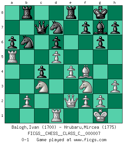 Last move : 0-1 2006 November 30 16:25:6 [Event "FICGS__CHESS__CLASS_C__000007"] [Site "FICGS"] [Date "2006.06.21"] [Round "1"] [White "Balogh,Ivan"] [Black "Hrubaru,Mircea"] [Result "0-1"] [WhiteElo "1700"] [BlackElo "1775"] 1.c4 Nf6 2.Nf3 e6 3.d4 c5 4.d5 d6 5.Nc3 exd5 6.cxd5 Bg4 7.e4 Nbd7 8.h3 Bh5 9.Bf4 Be7 10.Be2 O-O 11.O-O a6 12.Nh4 Bxe2 13.Qxe2 g6 14.Nf3 Qc7 15.a4 Rfe8 16.Bd2 Bf8 17.a5 Bg7 18.Rfd1 c4 19.Ra4 b5 20.axb6 Nxb6 21.Ra5 Rab8 22.Bf4 Nfd7 0-1 This chess game has been lost on time (started : 2006.06.21 23:20:27) English Opening Kingside Castling by player Black (move 10) Kingside Castling by player White (move 11) Player Black won this chess game. Follow this game move after move (download)Weak points or holes in the opponent's position must be occupied by pieces not Pawns. (Siegbert Tarrasch) Zum Sieg gelangt man nicht, wenn man gut, sondern nur wenn man besser spielt (Savielly Grigorievitsch Tartakower) La caracteristica mas importante en la posición del Ajedrez es la actividad de las piezas. Esto es absolutamente fundamental en todas las fases del juego: Apertura, Juego Medio y especialmente Finales. La limitación primordial en la actividad de una pieza, es la estructuración de los Peones. (Michael Stean) On peut tirer plus d'utilité d'une partie perdue que de 100 parties gagnées. (Capablanca) Man is still the most extraordinary computer of all. (John F. Kennedy)
