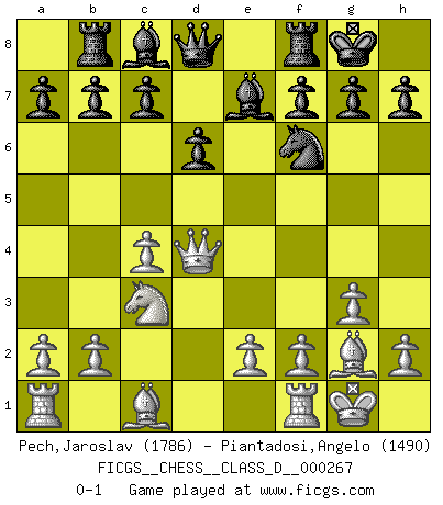 Last move : 0-1 2020 September 5 12:27:26 [Event "FICGS__CHESS__CLASS_D__000267"] [Site "FICGS"] [Date "2020.07.17"] [Round "1"] [White "Pech,Jaroslav"] [Black "Piantadosi,Angelo"] [Result "0-1"] [WhiteElo "1786"] [BlackElo "1490"] 1.c4 e5 2.Nc3 d6 3.g3 Nf6 4.Bg2 Nc6 5.Nf3 Be7 6.d4 exd4 7.Nxd4 Nxd4 8.Qxd4 O-O 9.O-O Rb8 0-1 This chess game has been lost on time (started : 2020.07.17 11:59:31) English Opening Kingside Castling by player Black (move 8) Kingside Castling by player White (move 9) Player Black won this chess game. Follow this game move after move (download)A bad day of Chess is better than any good day at work. (Anonymous) Frage des Reporters: -Worin besteht das Ziel von Gambiteröffnungen? Antwort: -Auf Kosten der Partie einen Ruf als Angriffspieler zu erwerben.- (Siegbert Tarrasch) Prefiero perder una partida realmente buena, que ganar una mala. (David Levy) Karpov est une pièce de musée. (Garry Kasparov) War is the child of passion, passion is the child of narcissism and narcissism is the child. (...) Another game ? (Thibault de Vassal)