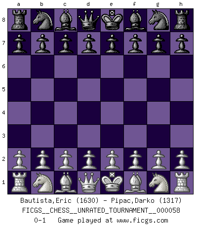 Last move : 0-1 2020 August 27 1:41:15 [Event "FICGS__CHESS__UNRATED_TOURNAMENT__000058"] [Site "FICGS"] [Date "2020.07.17"] [Round "1"] [White "Bautista,Eric"] [Black "Pipac,Darko"] [Result "0-1"] [WhiteElo "1630"] [BlackElo "1317"] 0-1 This chess game has been lost on time (started : 2020.07.17 19:42:27) Player Black won this chess game. Follow this game move after move (download)A thorough understanding of the typical mating continuations makes the most complicated sacrificial combinations leading up to them not only not difficult, but almost a matter of course. (Siegbert Tarrasch) Schach ist die gewalttätigste aller Sportarten. (Garry Kasparov) Dejen al perfeccionista jugar por correo. (Yasser Seirawan) Donnez-moi un Cavalier en 6e et je gagnerais toutes mes parties. (Steinitz) There are more things in heaven and earth than practically anywhere else. (Unknown)