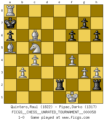 Last move : 1-0 2020 September 26 4:57:43 [Event "FICGS__CHESS__UNRATED_TOURNAMENT__000058"] [Site "FICGS"] [Date "2020.07.17"] [Round "1"] [White "Quintero,Raul"] [Black "Pipac,Darko"] [Result "1-0"] [WhiteElo "1822"] [BlackElo "1317"] 1.Nf3 d5 2.b3 Nc6 3.Bb2 Nf6 4.e3 Bg4 5.Bb5 Qd7 6.h3 Bxf3 7.Qxf3 a6 8.Be2 Ne4 9.d3 Ng5 10.Qg3 h6 11.f4 Ne6 12.Nd2 f6 13.Qg6+ Kd8 14.O-O b6 15.e4 Qd6 16.Bh5 Kc8 17.g3 Ncd4 18.Rac1 Kb7 19.c3 Nb5 20.a4 Na7 21.Rce1 Nc5 22.e5 Qc6 23.exf6 exf6 24.Bf3 Nc8 25.c4 Ne7 26.Qf7 Nxd3 27.Rxe7 Qc5+ 28.Kh2 Bxe7 29.Bc3 Rad8 30.Bxd5+ Kb8 31.Ne4 Qa3 32.a5 bxa5 33.Rd1 Nc5 34.Qxe7 Rhe8 35.Qxc5 Qxc5 36.Nxc5 Re2+ 37.Kg1 c6 38.Kf1 Rh2 39.Bxa5 Re8 40.Bxc6 R8e2 41.Rd8+ Ka7 42.Ra8+ 1-0 Reti : Nimzovich-Larsen attack Kingside Castling by player White (move 14) Player White won this chess game. Follow this game move after move (download)In order to improve your game, you must study the endgame before everything else, for whereas the endings can be studied and mastered by themselves, the middle game and the opening must be studied in relation to the endgame. (Jose Raul Capablanca) Ich weiss nicht was Gott gegen mich auf 1.e4 antworten würde. (Robert James Fischer) Debió haber existido una vez en que los hombres eran semidióses, de otra manera no hubiesen podido inventar el Ajedrez. (Gustav Schenk) C'est une question de caractère, Beaucoup de gens perdent leur motivation très vite. D'autres, ils sont rares, peuvent la conserver très longtemps. J'aime les échecs, encore aujourd'hui je suis heureux d'analyser des parties. J'aime toujours gagner, je déteste encore perdre. Bien jouer est important pour mon intégrité intellectuelle et morale. Et puis les échecs vivent en ce moment une période historique grâce à Internet. Ils se développent dans les systèmes éducatifs à travers le monde. Ils sortent de leur ghetto, et c'est mon rôle de mener à bien cette révolution. (Gary Kasparov) Employ the attack like tactic of defense. (Chinese proverb)