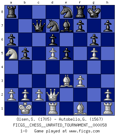Last move : 1-0 2020 October 9 14:19:54 [Event "FICGS__CHESS__UNRATED_TOURNAMENT__000058"] [Site "FICGS"] [Date "2020.07.17"] [Round "1"] [White "Olsen,Sverre Eugen"] [Black "Autobello,Giovanni"] [Result "1-0"] [WhiteElo "1705"] [BlackElo "1567"] 1.e4 c5 2.Nf3 d6 3.d4 cxd4 4.Nxd4 Nf6 5.Nc3 a6 6.Be3 e5 7.Nb3 Be6 8.f3 Be7 9.Qd2 O-O 10.O-O-O Qc7 11.g4 b5 12.Kb1 Nbd7 13.g5 Ne8 14.Nd5 Bxd5 15.exd5 g6 16.Na5 1-0 This chess game has been lost on time (started : 2020.07.17 19:42:27) Sicilian : Najdorf, Byrne (English) attack Kingside Castling by player Black (move 9) Queenside Castling by player White (move 10) Player White won this chess game. Follow this game move after move (download)Fischer sacrificed virtually everything most of us weakies (to use his term) value, respect, and cherish, for the sake of an artful, often beautiful board game, for the ambivalent privilege of being its greatest master. (Paul Kollar) Es gibt keine einzige Frau, der ich nicht einen Springer vorgeben könnte und trotzdem gewänne. (Robert James Fischer) Me dio la sensación de como si yo estuviera jugando en contra del mismo Ajedrez. - al estar jugando en contra de Robert Fischer (Walter Shipman) Tous ces prétendus hommes politiques sont les pions, les Cavaliers, les Tours ou les Fous d'une partie d'échecs qui se jouera tant qu'un hasard ne renversera pas l'échiquier. (Honoré de Balzac) I'll be back. (Arnold Schwarzenegger)