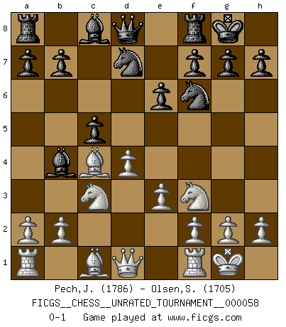 Last move : 0-1 2020 August 28 12:30:9 [Event "FICGS__CHESS__UNRATED_TOURNAMENT__000058"] [Site "FICGS"] [Date "2020.07.17"] [Round "1"] [White "Pech,Jaroslav"] [Black "Olsen,Sverre Eugen"] [Result "0-1"] [WhiteElo "1786"] [BlackElo "1705"] 1.d4 Nf6 2.c4 e6 3.Nc3 Bb4 4.e3 O-O 5.Bd3 d5 6.Nf3 c5 7.O-O dxc4 8.Bxc4 Nbd7 0-1 This chess game has been lost on time (started : 2020.07.17 19:42:27) Nimzo-Indian : 4.e3 O-O, 5.Bd3 d5 Kingside Castling by player Black (move 4) Kingside Castling by player White (move 7) Player Black won this chess game. Follow this game move after move (download)For surely of all the drugs in the world, Chess must be the most permanently pleasurable. (Assiac) Gewinnen beim Schach fördert das Selbstvertrauen. Beim Sex spüre ich sowas nicht... (Garry Kasparov) El Ajedrez es tortura mental. (Garry Kasparov) On peut tirer plus d'utilité d'une partie perdue que de 100 parties gagnées. (Capablanca) Hardware: the parts of a computer that can be kicked. (Jeff Persis)