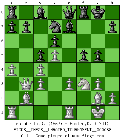 Last move : 0-1 2020 November 11 7:42:17 [Event "FICGS__CHESS__UNRATED_TOURNAMENT__000058"] [Site "FICGS"] [Date "2020.07.17"] [Round "1"] [White "Autobello,Giovanni"] [Black "Foster,Duncan"] [Result "0-1"] [WhiteElo "1567"] [BlackElo "1941"] 1.c4 f5 2.g3 e6 3.Bg2 Nf6 4.d4 Be7 5.Nf3 O-O 6.O-O d6 7.Nc3 c5 8.e3 Na6 9.Qb3 Ne4 10.d5 Nxc3 11.bxc3 Qe8 12.Bb2 e5 13.Rfe1 e4 14.Nd2 Nb8 15.a4 Nd7 16.f3 exf3 17.Nxf3 g5 0-1 This chess game has been lost on time (started : 2020.07.17 19:42:27) Follow this game move after move (download)You know, comrade Pachman, I don't enjoy being a Minister, I would rather play Chess like you. (Che Guevara) Schach ist ein Teil der Kultur, und wenn es mit der Kultur abwärts geht, geht es auch mit dem Schach abwärts. (Mikhail Moiseyevich Botvinik) Si el Ajedrez es una ciencia, es la mas inexacta. Si el Ajedrez es un arte, es demasiado inexacto para ser visto como tal. Si el Ajedrez es un deporte, es demasiado esotérico. Si el Ajedrez es un juego, es demasiado exigente para ser solo un juego. Si el Ajedrez es una aventura, es una muy demandante. Si el Ajedrez es una pasión, es una muy gratificante. Si el Ajedrez es la vida, es una muy triste. (Anónimo) Que feriez-vous si vous étiez en train de jouer aux échecs et que la fin du monde arrive ? Je continuerais à jouer. (Saint Borromée) Follow your passion, and success will follow you. (Arthur Buddhold)