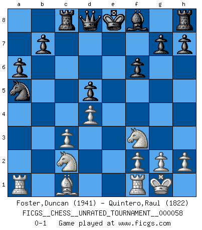 Last move : 0-1 2020 September 29 13:24:13 [Event "FICGS__CHESS__UNRATED_TOURNAMENT__000058"] [Site "FICGS"] [Date "2020.07.17"] [Round "1"] [White "Foster,Duncan"] [Black "Quintero,Raul"] [Result "0-1"] [WhiteElo "1941"] [BlackElo "1822"] 1.e4 c5 2.a3 Nc6 3.b4 cxb4 4.axb4 Nxb4 5.d4 d5 6.c3 Nc6 7.exd5 Qxd5 8.Na3 Bf5 9.Nc4 Bg6 10.Ne3 Qd8 11.Bb5 e6 12.Qa4 Nge7 13.Nf3 a6 14.O-O f6 15.Bc4 Nd5 16.Qb3 Na5 17.Qc2 Bxc2 18.Bxd5 exd5 19.Nxc2 Rc8 0-1 Sicilian defense Kingside Castling by player White (move 14) Player Black won this chess game. Follow this game move after move (download)Chess, like love, like music, has the power to make people happy. (Siegbert Tarrasch) Man braucht nicht immer den besten Zug zu spielen: Ein Zug muß aktiv, unternehmungslustig, korrekt und schön sein. (David Bronstein) El Ajedrez demanda una total concentración. (Bobby Fischer) La tactique, c'est ce que vous faites quand il y a quelque chose à faire; la stratégie, c'est ce que vous faites quand il n'y a rien à faire. (Savielli Tartacower) Life is like internet, nothing interesting, but noone want to leave it. (Ilmars Cirulis)