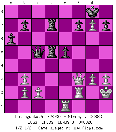 Last move : 1/2-1/2 2020 September 15 18:3:58 [Event "FICGS__CHESS__CLASS_B__000328"] [Site "FICGS"] [Date "2020.07.19"] [Round "1"] [White "Duttagupta,Aniruddha"] [Black "Mirra,Theodore"] [Result "1/2-1/2"] [WhiteElo "2090"] [BlackElo "2000"] 1.e4 c5 2.Nf3 d6 3.d4 cxd4 4.Nxd4 Nf6 5.Nc3 a6 6.Be3 e5 7.Nb3 Be6 8.h3 Be7 9.f4 Nc6 10.f5 Bxb3 11.axb3 Nb4 12.g3 d5 13.exd5 Qc7 14.Bg2 Rd8 15.Qe2 O-O 16.Bf2 Bc5 17.O-O Nbxd5 18.Nxd5 Nxd5 19.Rae1 Bxf2+ 20.Rxf2 Qb8 21.Bxd5 Rxd5 22.f6 Qd6 23.fxg7 Rd8 24.Qe3 Qc5 25.Qf3 R8d7 26.Kh2 1/2-1/2 Sicilian : Najdorf, Byrne (English) attack Kingside Castling by player Black (move 15) Kingside Castling by player White (move 17) This chess game ended in a draw. Follow this game move after move (download)Up to this point White has been following well-known analysis. But now he makes a fatal error: he begins to use his own head. (Siegbert Tarrasch) Frage des Reporters: -Welche besonderen Umstände rechtfertigen das Anhalten der Uhren während einer Turnierpartie? Antwort: -Einen Fotographen zu strangulieren. (Siegbert Tarrasch) Cada Peón es una Reina en potencia. (James Mason) Le succès, c'est être capable d'aller d'échec en échec sans perdre son enthousiasme. (Winston Churchill) Wisdom is the reward you get for a lifetime of listening when you'd have preferred to talk. (Doug Larson)