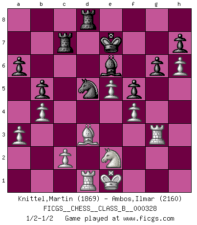 Last move : 1/2-1/2 2021 March 13 8:0:48 [Event "FICGS__CHESS__CLASS_B__000328"] [Site "FICGS"] [Date "2020.07.19"] [Round "1"] [White "Knittel,Martin"] [Black "Ambos,Ilmar"] [Result "1/2-1/2"] [WhiteElo "1869"] [BlackElo "2160"] 1.e4 e6 2.d4 d5 3.Nc3 Nf6 4.e5 Nfd7 5.f4 c5 6.Nf3 Nc6 7.Be3 a6 8.a3 cxd4 9.Nxd4 Bc5 10.Qd2 O-O 11.O-O-O Rb8 12.h4 Nxd4 13.Bxd4 b5 14.Bxc5 Nxc5 15.b4 Nd7 16.Ne2 Nb6 17.Nd4 Bd7 18.h5 Qe7 19.h6 g6 20.Rh3 f5 21.Qf2 Na4 22.Qh4 Qf7 23.Kd2 Qe8 24.Rb3 Qd8 25.Qxd8 Rfxd8 26.Ra1 Ra8 27.Bd3 Ra7 28.R3b1 Kf7 29.Rg1 Rc7 30.g4 Nc3 31.gxf5 exf5 32.Ke3 Ra8 33.Nb3 d4+ 34.Nxd4 Rd8 35.Ne2 Nd5+ 36.Kf2 Be6 37.Rad1 Rcd7 38.Rg3 Nb6 39.Ng1 Ke7 40.Ke1 Nd5 41.Ne2 Rc8 42.Kf2 Rdc7 43.Ke1 Rd8 1/2-1/2 Follow this game move after move (download)The beauty of a move lies not in its' appearance but in the thought behind it. (Siegbert Tarrasch) Bobby Fischer ist kein Vorbild für die heutige Jugend. (Viktor Kortschnoi) Una partida de Ajedrez se divide en 3 etapas: la primera cuando piensas que tienes la ventaja, la segunda cuando crees que tienes la ventaja y la tercera... ¡cuando te das cuenta que vas a perder!. (Savielly Tartakower) Les pièces de l'échiquier étaient impitoyables. Elles le retenaient, elles l'absorbaient. Il y avait de l'horreur en cela, mais aussi une harmonie unique. Car, qu'y a-t-il dans le monde, à part les échecs ? (V. Nabokov) The quality of decision is like the well-timed swoop of a falcon which enables it to strike and destroy its victim. (Sun Tzu)