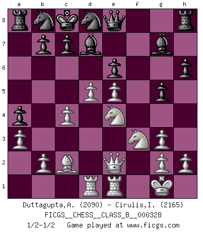 Last move : 1/2-1/2 2020 November 26 19:24:10 [Event "FICGS__CHESS__CLASS_B__000328"] [Site "FICGS"] [Date "2020.07.19"] [Round "1"] [White "Duttagupta,Aniruddha"] [Black "Cirulis,Ilmars"] [Result "1/2-1/2"] [WhiteElo "2090"] [BlackElo "2165"] 1.d4 f5 2.Bg5 h6 3.Bh4 g5 4.e4 Bg7 5.Bg3 d6 6.Bc4 d5 7.Qh5+ Kf8 8.Bxd5 e6 9.Bb3 f4 10.c3 fxg3 11.fxg3 Ke7 12.e5 Qe8 13.Qe2 a5 14.Nf3 Kd8 15.Nbd2 Ne7 16.O-O Bd7 17.Ne4 Nd5 18.c4 Nb4 19.a3 N4c6 20.Rad1 a4 21.Bc2 Kc8 22.Rfe1 Nd8 23.d5 1/2-1/2 Follow this game move after move (download)The Chess pieces are the block alphabet which shapes thoughts; and these thoughts, although making a visual design on the chessboard, express their beauty abstractly, like a poem. (Marcel Duchamp) Aljechin war kein Nazi. Er war ein Opportunist. Ein schrecklicher Mann. Er liebte Geld über alles und würde für Geld ein Jude, ein Katolik oder ein Protestant werden. (Miguel Najdorf) No nos podemos resistir a la fascinación de un sacrificio ya que la pasión por los sacrificios es parte de la naturaleza de un jugador de Ajedrez. (Rudolf Spielman) Toutes les manuvres exécutées sur une colonne ouverte ont pour but ultime l'intrusion définitive sur la septième ou la huitième rangée, en plein cur de la position ennemie. (Aaron Nimzovitch) At work, the authority of a person is inversely proportional to the number of pens that person is carrying. (Dan Rotaru)