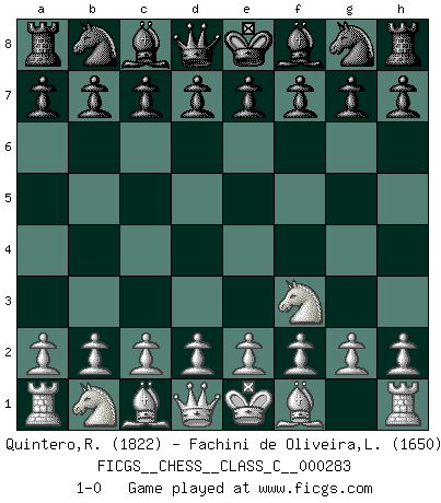 Last move : 1-0 2020 August 31 12:30:28 [Event "FICGS__CHESS__CLASS_C__000283"] [Site "FICGS"] [Date "2020.07.21"] [Round "1"] [White "Quintero,Raul"] [Black "Fachini de Oliveira,Leandro Theo"] [Result "1-0"] [WhiteElo "1822"] [BlackElo "1650"] 1.Nf3 1-0 This chess game has been lost on time (started : 2020.07.21 18:42:53) Reti Opening Player White won this chess game. Follow this game move after move (download)Who is your opponent tonight, tonight I am playing against the Black pieces. (Akiba Rubinstein) Zum Sieg gelangt man nicht, wenn man gut, sondern nur wenn man besser spielt (Savielly Grigorievitsch Tartakower) Un jugador que trata de regresar una movida en el Ajedrez es un futuro carterista. (Richard Fenton) On croit qu'il y a plus de mauvais joueurs que de bons joueurs, c'est faux : Il y a autant de joueurs qui gagnent que de joueurs qui perdent. (Philippe Geluck) When you've done things right people won't know you've done anything at all. (Futurama)