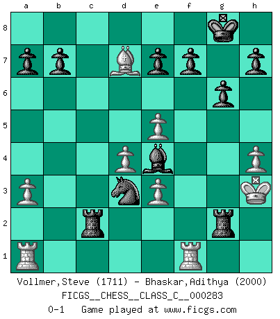 Last move : 0-1 2020 November 8 11:23:48 [Event "FICGS__CHESS__CLASS_C__000283"] [Site "FICGS"] [Date "2020.07.21"] [Round "1"] [White "Vollmer,Steve"] [Black "Bhaskar,Adithya"] [Result "0-1"] [WhiteElo "1711"] [BlackElo "2000"] 1.d4 Nf6 2.c4 g6 3.Nc3 d5 4.Bf4 Bg7 5.Nf3 O-O 6.cxd5 Nxd5 7.Nxd5 Qxd5 8.Bxc7 Bf5 9.e3 Nc6 10.Be2 Rac8 11.Bg3 Qa5+ 12.Qd2 Nb4 13.O-O Rc2 14.Qe1 Rxb2 15.Ne5 Qa4 16.Bd1 Nc2 17.a3 Rc8 18.f4 Bxe5 19.fxe5 Nxe1 20.Bxa4 Rxg2+ 21.Kh1 Be4 22.h4 Rxg3 23.Kh2 Rg2+ 24.Kh3 Nd3 25.Bd7 R8c2 0-1 Follow this game move after move (download)Many Chess players were surprised when after the game, Fischer quietly explained: 'I had already analyzed this possibility' in a position which I thought was not possible to foresee from the opening. (Mikhail Tal) Matt entspricht nicht immer den Tatsachen. (Savielly Grigorievitsch Tartakower) Si tu oponente no puede hacer nada activo, entonces no apures la posición; En vez de eso, dejalo estar sentado ahí, sufriendo y rogandote por un empate. (Jeremy Silman) Tout change constamment, y compris dans le monde des Echecs. (Botvinnik) There is no instance of a country having benefited from prolonged warfare. (Sun Tzu)