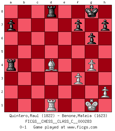 Last move : 0-1 2020 August 13 22:6:47 [Event "FICGS__CHESS__CLASS_C__000283"] [Site "FICGS"] [Date "2020.07.21"] [Round "1"] [White "Quintero,Raul"] [Black "Benone,Mateia"] [Result "0-1"] [WhiteElo "1822"] [BlackElo "1623"] 1.e4 c5 2.Nf3 Nc6 3.d4 cxd4 4.Nxd4 g6 5.Be3 Bg7 6.Nc3 Nf6 7.f3 O-O 8.Qd2 d5 9.exd5 Nxd5 10.Nxc6 bxc6 11.Nxd5 cxd5 12.c3 Qa5 13.Bd3 Rb8 14.O-O d4 15.c4 Qxd2 16.Bxd2 Rxb2 17.Bc1 Rb7 18.Ba3 Re8 19.Rfe1 Be6 20.Re2 Reb8 21.g4 Bxc4 22.Rd1 Bxd3 23.Rxd3 e5 24.Bd6 Rd8 25.Bxe5 Re7 26.Bxg7 Rxe2 27.Bxd4 Rxa2 28.Rd1 Ra4 0-1 Sicilian defense Kingside Castling by player Black (move 7) Kingside Castling by player White (move 14) Player Black won this chess game. Follow this game move after move (download)A strong memory, concentration, imagination, and a strong will is required to become a great Chess player. (Bobby Fischer) Sie bekommen vielleicht den Eindruck, dass die Spitzenspieler überhaupt gar nicht so stark sind. Aber das stimmt nicht. Es ist eine Illusion. Mit einem Computer an der Seite ist es sehr leicht, Urteile zu fällen, aber wenn man alleine am Brett sitzt, sieht die Sache ganz anders aus. (Vladimir Kramnik) Hasta este punto, las blancas han seguido un análisis bien conocido. Pero ahora el hace un error fatal: empieza a usar su propia cabeza. (Siegbert Tarrasch) Votre seul travail dans les ouvertures est d'obtenir un milieu de partie jouable. (Lajos Portish) Those parts of the system that you can hit with a hammer (not advised) are called hardware; those program instructions that you can only curse at are called software. (Anonymous)