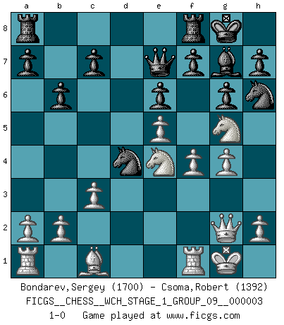 Last move : 1-0 2007 September 25 20:29:15 [Event "FICGS__CHESS__WCH_STAGE_1_GROUP_09__000003"] [Site "FICGS"] [Date "2007.07.11"] [Round "1"] [White "Bondarev,Sergey"] [Black "Csoma,Robert"] [Result "1-0"] [WhiteElo "1700"] [BlackElo "1392"] 1.e4 d6 2.d4 Nf6 3.Bd3 g6 4.f4 Bg7 5.Nf3 O-O 6.O-O b6 7.e5 Ng4 8.Nc3 Bb7 9.Qe2 dxe5 10.dxe5 e6 11.Be4 Nc6 12.Ng5 Nh6 13.g4 Nd4 14.Qg2 Bxe4 15.Ncxe4 Qe7 16.c3 1-0 King's pawn Opening Kingside Castling by player Black (move 5) Kingside Castling by player White (move 6) Player White won this chess game. Follow this game move after move (download)When the Chess game is over, the Pawn and the King go back to the same box. (Irish saying) Frage: Wie viele Autos haben Sie schon zerstört? - Antwort: Nur zwei. (Loek van Wely) Muchos jugadores de Ajedrez se sorprendían cuando después de la partida, Fischer explicaba con calma: 'Yo ya había analizado esta posibilidad' en una posición en la cual yo creía que no era posible de prever desde la apertura. (Mikhail Tal) Ce n'est pas pour s'amuser qu'il joue aux échecs : il célèbre un culte. (Vladimir Nabokov) The smarter you play, the luckier you'll be. (Mark Pilarski)