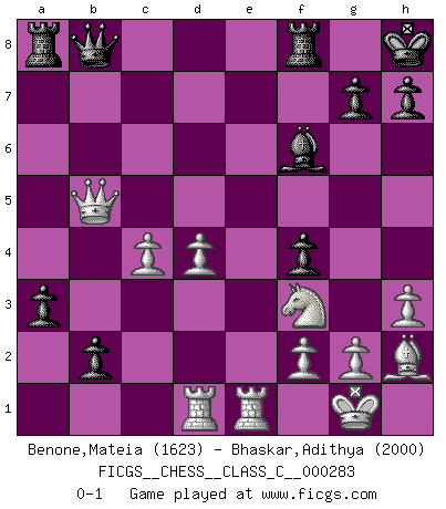 Last move : 0-1 2020 August 10 8:17:12 [Event "FICGS__CHESS__CLASS_C__000283"] [Site "FICGS"] [Date "2020.07.21"] [Round "1"] [White "Benone,Mateia"] [Black "Bhaskar,Adithya"] [Result "0-1"] [WhiteElo "1623"] [BlackElo "2000"] 1.e4 c5 2.b4 cxb4 3.d4 d5 4.exd5 Nf6 5.a3 Qxd5 6.Nf3 e6 7.Bd3 Nc6 8.O-O Qd8 9.axb4 Bxb4 10.c3 Be7 11.h3 O-O 12.Bf4 a6 13.Qc2 b6 14.Nbd2 Bb7 15.Rfd1 Rc8 16.Qb2 Nd5 17.Bg3 b5 18.Rdc1 b4 19.Ne4 a5 20.c4 Nf6 21.Re1 Ra8 22.Bc2 Nxe4 23.Bxe4 f5 24.Bc2 f4 25.Bh2 Bf6 26.Rad1 a4 27.Be4 a3 28.Qe2 b3 29.Bxc6 Bxc6 30.Qxe6+ Kh8 31.Qxc6 b2 32.Qb5 Qb8 0-1 Sicilian : wing gambit Kingside Castling by player White (move 8) Kingside Castling by player Black (move 11) Player Black won this chess game. Follow this game move after move (download)It is no time to be playing Chess when the house is on fire. (Italian Proverb) Die Partien sind immer verschieden, die Interviews immer die gleichen. (Garry Kasparov) El Ajedrez no es una pizca de inferior al violín, y tenemos un gran número de violinistas profesionales. (Mikhail Botvinnik) Ce qui caractérise les parties de combat, c'est que si le défenseur a constamment de difficiles problèmes à résoudre, l'attaquant doit chercher sans relâche de nouvelles possibilités d'attaque. (Koblentz) The arrogant army will lose certainly the battle. (Chinese proverb)