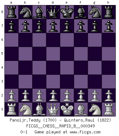 Last move : 0-1 2020 August 21 1:45:20 [Event "FICGS__CHESS__RAPID_B__000349"] [Site "FICGS"] [Date "2020.07.21"] [Round "1"] [White "Panoljr,Teddy"] [Black "Quintero,Raul"] [Result "0-1"] [WhiteElo "1700"] [BlackElo "1822"] 0-1 This chess game has been lost on time (started : 2020.07.21 22:26:35) Player Black won this chess game. Follow this game move after move (download)Daring ideas are like Chess men moved forward. They may be beaten, but they may start a winning game. (Johann Wolfgang von Goethe) Die Fehler sind da, Sie warten nur darauf gemacht zu werden. (Savielly Grigorievitsch Tartakower) Es el objetivo de la escuela moderna no tratar cada posición de acuerdo a una regla general, sino de acuerdo al principio inherente en la posición. (Richard Reti) Plusieurs personnes se sont demandées comment Tal faisait pour gagner... En fait, c'est très simple ! Il met ses pièces au centre de l'échiquier et les sacrifie quelque part ! (David Bronstein) They say in chess you've got to kill the queen, and then you mate it... Oh I, do you ? (Red Hot Chili Peppers, Fortune faded)