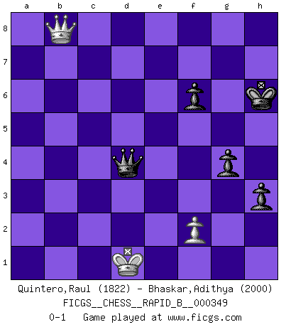 Last move : 0-1 2020 December 21 6:40:13 [Event "FICGS__CHESS__RAPID_B__000349"] [Site "FICGS"] [Date "2020.07.21"] [Round "1"] [White "Quintero,Raul"] [Black "Bhaskar,Adithya"] [Result "0-1"] [WhiteElo "1822"] [BlackElo "2000"] 1.c4 e5 2.Nc3 Nf6 3.g3 Bb4 4.Bg2 O-O 5.Qb3 Nc6 6.e3 Bxc3 7.Qxc3 d5 8.Ne2 dxc4 9.Qxc4 e4 10.Qc3 Bg4 11.b3 Nd5 12.Qc4 Bf3 13.Bxf3 exf3 14.Nf4 Qf6 15.d4 Nxf4 16.gxf4 Rfe8 17.Kd2 Qh4 18.Rf1 Rad8 19.Bb2 Ne7 20.Rad1 c5 21.Qb5 Qxh2 22.Qxb7 cxd4 23.Bxd4 Nf5 24.Kc3 Nxd4 25.Rxd4 Rxd4 26.exd4 Qxf4 27.Re1 Rd8 28.Qd5 Qf6 29.Qe5 Rc8+ 30.Kd2 Qc6 31.Qc5 Qa6 32.Qc4 Qa5+ 33.Kd1 Qd8 34.Qd3 h5 35.Qxf3 Qxd4+ 36.Ke2 Re8+ 37.Kf1 Rxe1+ 38.Kxe1 Qa1+ 39.Ke2 Qxa2+ 40.Kf1 g6 41.Qb7 Qa1+ 42.Kg2 a5 43.Qa8+ Kg7 44.b4 a4 45.b5 a3 46.b6 Qb2 47.b7 a2 48.b8Q Qxb8 49.Qxb8 a1Q 50.Qf4 Qf6 51.Qd2 h4 52.Qe3 g5 53.Qd2 g4 54.Qd5 Qf4 55.Kg1 h3 56.Qa5 f6 57.Qd5 Qc1+ 58.Kh2 Qc7+ 59.Kg1 Kh6 60.Qg8 Qd7 61.Qa8 Qe6 62.Kf1 Qc4+ 63.Ke1 Kg7 64.Qb7+ Kg6 65.Qb1+ Kh6 66.Qb8 Qc3+ 67.Kd1 Qd4+ 0-1 Follow this game move after move (download)A Chess game is a dialogue, a conversation between a player and his opponent. Each move by the opponent may contain threats or be a blunder, but a player cannot defend against threats or take advantage of blunders if he does not first ask himself: What is my opponent planning after each move ? (Bruce A. Moon) Karpov ist ein Museumsstück. (Garry Kasparov) ¡Examina movidas que hagan daño! Un buen ojo for movidas desvastantes es mucho mas importante que el conocimiento de principios estratégicos. (Purdy) Aux échecs, l'amour-propre est satisfait quand on remporte la victoire, mais il n'y a pas de honte à être battu. (Benjamin Franklin) Without enthusiasm, virtue functions not at all, and vice only poorly. (Mignon McLaughlin, The Neurotic's Notebook, 1960)
