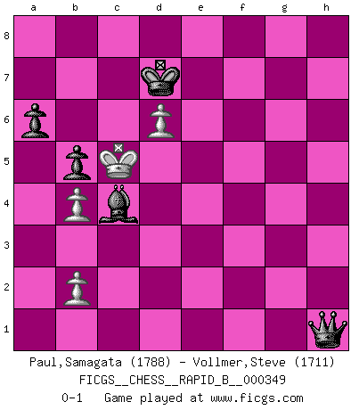 Last move : 0-1 2020 August 9 10:35:1 [Event "FICGS__CHESS__RAPID_B__000349"] [Site "FICGS"] [Date "2020.07.21"] [Round "1"] [White "Paul,Samagata"] [Black "Vollmer,Steve"] [Result "0-1"] [WhiteElo "1788"] [BlackElo "1711"] 1.d4 d5 2.Nf3 c5 3.c4 e6 4.e3 Nf6 5.Nc3 Nc6 6.cxd5 exd5 7.Bd3 Be7 8.O-O O-O 9.h3 b6 10.Bb5 Bb7 11.a3 Rc8 12.Qc2 a6 13.Bd3 Qd6 14.Bd2 Rfe8 15.Rfe1 Bf8 16.Qb1 cxd4 17.exd4 Rxe1+ 18.Qxe1 b5 19.Rc1 g6 20.Na2 Bg7 21.Bc3 Re8 22.Qd2 Ne4 23.Bxe4 dxe4 24.Nh2 Qd5 25.Nb4 Nxb4 26.axb4 f5 27.Qe3 Rc8 28.Rd1 h6 29.Nf1 g5 30.g3 f4 31.gxf4 gxf4 32.Qxf4 e3 33.f3 e2 34.Re1 exf1Q+ 35.Rxf1 Rf8 36.Qg4 Rxf3 37.Rxf3 Qxf3 38.Qxf3 Bxf3 39.Kf2 Bd5 40.Ke3 Bf6 41.Kf4 Kf7 42.Kf5 Be6+ 43.Ke4 Bxh3 44.Kd5 Bg2+ 45.Kc5 Bd8 46.d5 Ke7 47.Kc6 Ke8 48.Be5 h5 49.Kc5 Kd7 50.Bh2 h4 51.d6 h3 52.Bg3 Bf1 53.Bh2 Bc4 54.Be5 Bf6 55.Bf4 Bg5 56.Be5 Be3+ 57.Bd4 Bxd4+ 58.Kxd4 h2 59.Kc5 h1Q 0-1 Queen's pawn game, Krause variation Kingside Castling by player White (move 8) Kingside Castling by player Black (move 8) Promotion Queen by player Black (move 34) 10 pieces endgame at move 57 : White KPPP , Black KBBPPP WHITE : King + 3 Pawns BLACK : King + 2 Bishops 3 Pawns 9 pieces endgame at move 58 : White KPPP , Black KBPPP WHITE : King + 3 Pawns BLACK : King + 1 Bishop 3 Pawns Promotion Queen by player Black (move 59) Player Black won this chess game. Follow this game move after move (download)It is peculiar but a fact nevertheless, that gamblers in chess always have enthusiastic followers. (Botvinnik) Offensichtlich kennt Kasparow nichts anderes als Schach, und ich könnte 500 weitere Spieler dieser Sorte benennen. (Judith Polgar) Fischer deseaba darle a los Rusos una sopa de su propia medicina. (Larry Evans) Si je n'étais pas joueur d'échecs, je serais le meilleur dans quelque chose d'autre. (Anatoli Karpov) You can think I'm wrong, but that's no reason to quit thinking. (Gregory House, House M.D.)