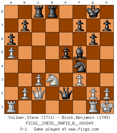 Last move : 0-1 2020 August 22 13:30:14 [Event "FICGS__CHESS__RAPID_B__000349"] [Site "FICGS"] [Date "2020.07.21"] [Round "1"] [White "Vollmer,Steve"] [Black "Block,Benjamin"] [Result "0-1"] [WhiteElo "1711"] [BlackElo "1745"] 1.e4 c5 2.Nf3 d6 3.d4 cxd4 4.Nxd4 Nf6 5.Nc3 a6 6.Be2 e5 7.Nb3 Be6 8.O-O Be7 9.Be3 O-O 10.a4 Nc6 11.f3 Nb4 12.a5 d5 13.exd5 Nfxd5 14.Nxd5 Nxd5 15.Bf2 Rc8 16.c3 Nf4 17.Nc1 Qc7 18.Re1 Rfd8 19.Qc2 g6 20.Bb6 Bc5+ 21.Bxc5 Qxc5+ 22.Kh1 Qf2 23.Rg1 Bf5 24.Nd3 Qxe2 0-1 Sicilian : Najdorf, Opovcensky variation Kingside Castling by player White (move 8) Kingside Castling by player Black (move 9) Player Black won this chess game. Follow this game move after move (download)You know, comrade Pachman, I don't enjoy being a Minister, I would rather play Chess like you. (Che Guevara) Ich habe die Schachforschung dermaßen betrieben, dass sie auf eine wissenschaftliche Basis gestellt wurde. (Mikhail Moiseyevich Botvinik) El hombre es un frívolo, una creatura engañosa y como un jugador de Ajedrez, se preocupa mas por el proceso de obtener su meta que de la meta por sí misma. (Dostoyevsky) Il s'avisa de me proposer d'apprendre les échecs qu'il jouait un peu... me voilà forcené des échecs. J'achète un échiquier, je m'enferme dans ma chambre, j'y passe des jours et des nuits à vouloir apprendre par cur toutes les parties. (Jean-Jacques Rousseau, Confessions) Whatever you do, don't be bored. This is absolutely the most exciting time we could have possibly hoped to be alive. And things are just starting. (From movie Waking life)