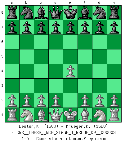 Last move : 1-0 2007 August 20 22:38:36 [Event "FICGS__CHESS__WCH_STAGE_1_GROUP_09__000003"] [Site "FICGS"] [Date "2007.07.11"] [Round "1"] [White "Bester,Kazimierz"] [Black "Krueger,Karsten"] [Result "1-0"] [WhiteElo "1600"] [BlackElo "1520"] 1.e4 1-0 This chess game has been lost on time (started : 2007.07.11 17:2:47) King's pawn Opening Player White won this chess game. Follow this game move after move (download)Look at Garry Kasparov. After he loses, invariably he wins the next game. He just kills the next guy. That's something that we have to learn to be able to do. (Maurice Ashley) Über Kasparov: Es ist offensichtlich, daß er in einem totalitären Staat aufwuchs und deshalb zu diktatorischen Zügen neigt. (Viktor Kortschnoi) La pasion por jugar al Ajedrez es una de las mas inexplicables en el mundo. (H.G. Wells) Si le désir cupide (et stupide) de gagner est une inépuisable source de souffrance, une combinaison brillante sur l'échiquier est une découverte : le coquelicot qui s'épanouit lorsque apparaît la Voie Lactée. (Arrabal) The various flowers seem good to different people. (Chinese proverb)