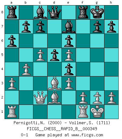 Last move : 0-1 2020 September 20 18:14:55 [Event "FICGS__CHESS__RAPID_B__000349"] [Site "FICGS"] [Date "2020.07.21"] [Round "1"] [White "Pernigotti,Nicolas"] [Black "Vollmer,Steve"] [Result "0-1"] [WhiteElo "2000"] [BlackElo "1711"] 1.d4 Nf6 2.c4 e6 3.Nc3 Bb4 4.Bd2 d5 5.e3 O-O 6.Nf3 a6 7.a3 Bd6 8.c5 Be7 9.b4 Nc6 10.Qc2 Nd7 11.Bd3 f5 12.O-O Nf6 13.Ne5 Nxe5 14.dxe5 Ne4 15.Nxe4 fxe4 0-1 This chess game has been lost on time (started : 2020.07.21 22:26:35) Nimzo-Indian defense Kingside Castling by player Black (move 5) Kingside Castling by player White (move 12) Player Black won this chess game. Follow this game move after move (download)Chess, like love, like music, has the power to make people happy. (Siegbert Tarrasch) Man braucht nicht immer den besten Zug zu spielen: Ein Zug muß aktiv, unternehmungslustig, korrekt und schön sein. (David Bronstein) Fischer no está bajo la obligación de nadie. (Joseph Platz) La tactique, c'est ce que vous faites quand il y a quelque chose à faire; la stratégie, c'est ce que vous faites quand il n'y a rien à faire. (Savielli Tartacower) A shortcut is the longest distance between two points. (Don Groves)