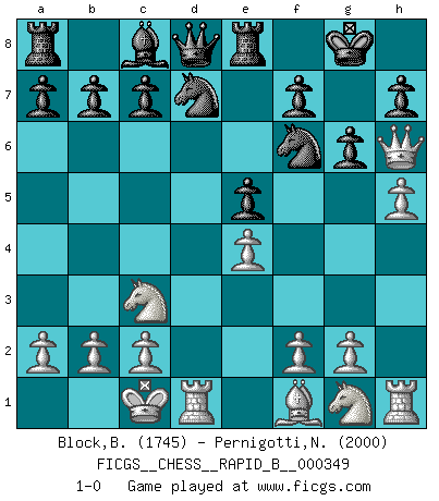 Last move : 1-0 2020 September 3 5:15:11 [Event "FICGS__CHESS__RAPID_B__000349"] [Site "FICGS"] [Date "2020.07.21"] [Round "1"] [White "Block,Benjamin"] [Black "Pernigotti,Nicolas"] [Result "1-0"] [WhiteElo "1745"] [BlackElo "2000"] 1.e4 d6 2.d4 Nf6 3.Nc3 g6 4.Be3 Bg7 5.Qd2 Nbd7 6.Bh6 O-O 7.O-O-O Bxh6 8.Qxh6 e5 9.dxe5 dxe5 10.h4 Re8 11.h5 1-0 This chess game has been lost on time (started : 2020.07.21 22:26:35) Pirc defense Kingside Castling by player Black (move 6) Queenside Castling by player White (move 7) Player White won this chess game. Follow this game move after move (download)Bobby Fischer is the greatest Chess player who has ever lived. (Ken Smith) Ich würde mich als ganz normalen Jungen bezeichnen [Im Alter von 12]. (Sergej Karjakin) El Ajedrez es tan inspirador que yo no creo que un buen jugador sea capaz de tener un pensamiento malo durante una partida. (Wilhelm Steinitz) On n'a jamais que l'âge auquel on a commence à jouer aux échecs car après on cesse de vieillir. (Capablanca) There will be no order, only chaos. (Sol Robeson in Pi by Darren Aronofsky)