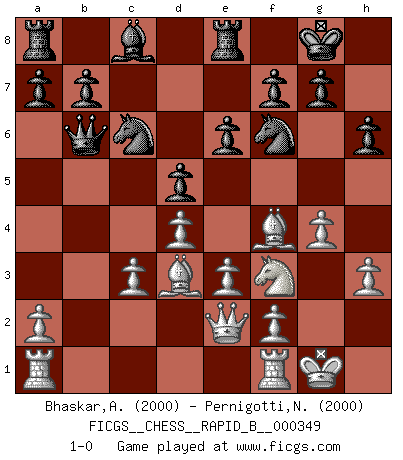 Last move : 1-0 2020 September 21 23:51:1 [Event "FICGS__CHESS__RAPID_B__000349"] [Site "FICGS"] [Date "2020.07.21"] [Round "1"] [White "Bhaskar,Adithya"] [Black "Pernigotti,Nicolas"] [Result "1-0"] [WhiteElo "2000"] [BlackElo "2000"] 1.d4 d5 2.c4 c6 3.cxd5 cxd5 4.Bg5 Nf6 5.Nc3 e6 6.e3 Be7 7.Nf3 h6 8.Bf4 O-O 9.Bd3 Nc6 10.g4 Qb6 11.Qe2 Re8 12.h3 Bb4 13.O-O Bxc3 14.bxc3 1-0 This chess game has been lost on time (started : 2020.07.21 22:26:35) QGD Slav defense : Exchange variation Kingside Castling by player Black (move 8) Kingside Castling by player White (move 13) Player White won this chess game. Follow this game move after move (download)No Chess Grandmaster is normal; they only differ in the extent of their madness. (Viktor Korchnoi) Ein Gewinn durch eine ungenaue Kombination, sei sie auch noch so vorzeigbar, erfüllt mich mit Schaudern. (Wilhelm Steinitz) El jugador blanco perdió porque fallo en recordar la coreccta continuación y tuvo que pensar por sí mismo las movidas. (Siegbert Tarrasch) Je menace de comprendre la position. (Anonyme) The general who wins the battle makes many calculations in his temple before the battle is fought. The general who loses makes but few calculations beforehand. (Sun Tzu)