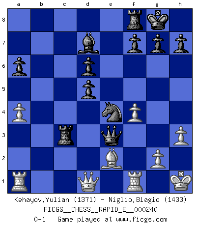 Last move : 0-1 2020 October 9 1:30:39 [Event "FICGS__CHESS__RAPID_E__000240"] [Site "FICGS"] [Date "2020.07.23"] [Round "1"] [White "Kehayov,Yulian"] [Black "Niglio,Biagio"] [Result "0-1"] [WhiteElo "1371"] [BlackElo "1433"] 1.Nf3 d5 2.d4 Nf6 3.c4 e6 4.Nc3 Be7 5.Bf4 Nc6 6.c5 b6 7.b4 O-O 8.e3 Nxb4 9.a3 Nc6 10.Be2 bxc5 11.dxc5 Bxc5 12.O-O Bd7 13.a4 Bd6 14.Bxd6 cxd6 15.h3 Rc8 16.Nb5 Qe7 17.Nfd4 Nxd4 18.Nxd4 e5 19.Nb5 a6 20.Nc3 Rxc3 21.f4 exf4 22.exf4 Qe3+ 23.Kh1 Ne4 0-1 This chess game has been lost on time (started : 2020.07.23 13:41:52) Reti Opening Kingside Castling by player Black (move 7) Kingside Castling by player White (move 12) Player Black won this chess game. Follow this game move after move (download)I like to say that Bobby Fischer was the greatest player ever. But what made Fischer a genius was his ability to blend an American freshness and pragmatism with Russian ideas about strategy. (Bruce Pandolfini) Vom Schach wurde gesagt das Leben sei dafür nicht lange genug. Aber das ist der Fehler des Lebens, nicht des Schach'. (Irving Chernev) Una buena ofensiva y una buena defensa, comienzan ambas con un buen desarrollo. (Bruce A. Moon) Des idées, des idées, j'en ai cent, j'en ai mille. Des bonnes, des mauvaises, applicables, irréalisables... Il suffit de faire le tri ! (Roos) For to win one hundred victories in one hundred battles is not the acme of skill. To subdue the enemy without fighting is the acme of skill. (Sun Tzu)