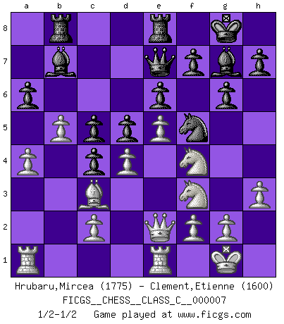 Last move : 1/2-1/2 2006 August 10 10:2:37 [Event "FICGS__CHESS__CLASS_C__000007"] [Site "FICGS"] [Date "2006.06.21"] [Round "1"] [White "Hrubaru,Mircea"] [Black "Clement,Etienne"] [Result "1/2-1/2"] [WhiteElo "1775"] [BlackElo "1600"] 1.a3 g6 2.b4 Bg7 3.Nc3 d5 4.Bb2 Nf6 5.Nf3 O-O 6.e3 a6 7.d4 Nc6 8.h3 e6 9.Bd3 Ne8 10.O-O Nd6 11.Ne2 b5 12.Nf4 Bb7 13.Qe2 Qe7 14.Rfd1 Rfe8 15.Bc3 Nc4 16.Bxc4 bxc4 17.a4 Na7 18.Nd2 Nc8 19.e4 Rb8 20.Re1 Nd6 21.e5 Nf5 22.b5 c5 23.Nf3 1/2-1/2 Anderssen's Opening Kingside Castling by player Black (move 5) Kingside Castling by player White (move 10) This chess game ended in a draw. Follow this game move after move (download)You know, comrade Pachman, I don't enjoy being a Minister, I would rather play Chess like you. (Che Guevara) Als er Schachweltmeister wurde ließ er praktisch alle stärksten Sovietspieler für sich arbeiten. Wenn ein auch nur mittelmässiger Meister ein Spezialist für eine bestimmte Eröffnung war, wurde er von Karpov gerufen. Das wurde alles geheim gehalten. (Mikhail Moiseyevich Botvinik) No hay precio que sea tan grande por la cabellera del Rey enemigo. (Koblentz) Que feriez-vous si vous étiez en train de jouer aux échecs et que la fin du monde arrive ? Je continuerais à jouer. (Saint Borromée) May I never be complete. May I never be content. May I never be perfect. Deliver me, Tyler, from being perfect and complete. (Chuck Palahniuk, Fight Club)