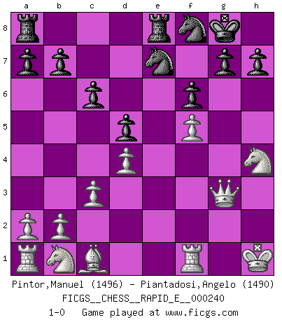 Last move : 1-0 2020 August 11 0:25:17 [Event "FICGS__CHESS__RAPID_E__000240"] [Site "FICGS"] [Date "2020.07.23"] [Round "1"] [White "Pintor,Manuel"] [Black "Piantadosi,Angelo"] [Result "1-0"] [WhiteElo "1496"] [BlackElo "1490"] 1.e4 e6 2.f4 d5 3.exd5 exd5 4.d4 Bd6 5.Nf3 Ne7 6.Bd3 O-O 7.O-O Bf5 8.Ne5 Bxd3 9.Qxd3 f6 10.Nf3 Nd7 11.c3 c6 12.Kh1 Re8 13.f5 Nf8 14.Nh4 Qc7 15.g3 Bxg3 16.hxg3 Qxg3 17.Qxg3 1-0 French : Labourdonnais variation Kingside Castling by player Black (move 6) Kingside Castling by player White (move 7) Player White won this chess game. Follow this game move after move (download)That's what Chess is all about. One day you give your opponent a lesson, the next day he gives you one. (Bobby Fischer) Nur ein wirklich starker Spieler weiß wie schwach er spielt. (Savielly Grigorievitsch Tartakower) Los Peones son el alma de una partida de Ajedrez. (Francois Andre Danican Philidor) Les Echecs sont et restent toujours un combat, un combat intégral comme la boxe, la lutte ou un autre sport, et où il doit y avoir un vainqueur et un vaincu. (Joseph Emil Diemer) Do not put your faith in what statistics say until you have carefully considered what they do not say. (William W. Watt)
