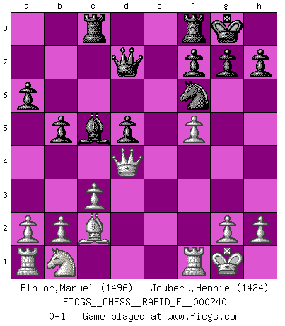 Last move : 0-1 2020 August 10 20:15:10 [Event "FICGS__CHESS__RAPID_E__000240"] [Site "FICGS"] [Date "2020.07.23"] [Round "1"] [White "Pintor,Manuel"] [Black "Joubert,Hennie"] [Result "0-1"] [WhiteElo "1496"] [BlackElo "1424"] 1.e4 c5 2.f4 Nc6 3.Nf3 e6 4.f5 d6 5.Bc4 d5 6.exd5 exd5 7.Bb5 Be7 8.O-O Nf6 9.Ne5 Bd7 10.Nxd7 Qxd7 11.c3 O-O 12.d4 a6 13.Ba4 b5 14.Bc2 Rac8 15.Be3 cxd4 16.Bxd4 Nxd4 17.Qxd4 Bc5 0-1 Sicilian : Grand Prix attack Kingside Castling by player White (move 8) Kingside Castling by player Black (move 11) Player Black won this chess game. Follow this game move after move (download)Later, I began to succeed in decisive games. Perhaps because I realized a very simple truth: not only was I worried, but also my opponent. (Mikhail Tal) Immer nach dem besten Zug zu suchen ist ziemlich unpraktisch. (Nigel Short) El Ajedrez tiene tanto misterio como las mujeres. (Purdy) Karpov est une pièce de musée. (Garry Kasparov) Remember : Your focus determines your reality. (Qui-Gon Jinn in Star Wars ep.1)