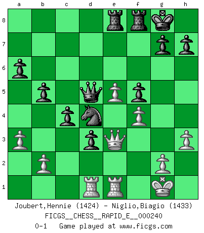 Last move : 0-1 2020 September 1 14:11:35 [Event "FICGS__CHESS__RAPID_E__000240"] [Site "FICGS"] [Date "2020.07.23"] [Round "1"] [White "Joubert,Hennie"] [Black "Niglio,Biagio"] [Result "0-1"] [WhiteElo "1424"] [BlackElo "1433"] 1.e4 c6 2.d4 d5 3.exd5 cxd5 4.c4 Nf6 5.Nc3 Nc6 6.Nf3 Bg4 7.Be2 e6 8.O-O Be7 9.Bg5 O-O 10.h3 Bxf3 11.Bxf3 dxc4 12.Be3 Rc8 13.a3 a6 14.Qe2 b5 15.Rad1 Qd7 16.Rfe1 Nd5 17.Bxd5 exd5 18.Bf4 Bf6 19.Be5 Bxe5 20.dxe5 d4 21.Qe4 d3 22.Nd5 Rce8 23.f4 f5 24.Qf3 Nd4 25.Qe3 Qxd5 0-1 Caro-Kann : Panov-Botvinnik attack Kingside Castling by player White (move 8) Kingside Castling by player Black (move 9) Player Black won this chess game. Follow this game move after move (download)Chess teaches you to control the initial excitement you feel when you see something that looks good and it trains you to think objectively when you're in trouble. (Stanley Kubrick) Ich habe die Schachforschung dermaßen betrieben, dass sie auf eine wissenschaftliche Basis gestellt wurde. (Mikhail Moiseyevich Botvinik) Solo el jugador con la iniciativa tiene el derecho a atacar. (Wilhelm Steinitz) La menace est plus forte que l'exécution. (Aaron Nimzovitch) Mac users swear by their computers. PC users swear at their computers. (Author unknown)
