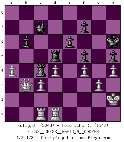 Last move : 1/2-1/2 2020 October 11 6:38:41 [Event "FICGS__CHESS__RAPID_A__000258"] [Site "FICGS"] [Date "2020.07.24"] [Round "1"] [White "Kuliy,Oleksandr"] [Black "Hendricks,Richard"] [Result "1/2-1/2"] [WhiteElo "2043"] [BlackElo "1942"] 1.d4 Nf6 2.c4 e6 3.Nf3 Bb4+ 4.Nc3 c5 5.e3 O-O 6.Bd3 d5 7.O-O cxd4 8.exd4 dxc4 9.Bxc4 b6 10.Bg5 Bb7 11.Re1 Nc6 12.a3 Bxc3 13.bxc3 h6 14.Bh4 Ne7 15.Bxf6 gxf6 16.Bd3 Rc8 17.Rc1 Qd6 18.Qd2 Kg7 19.Nh4 Nd5 20.g3 Ne7 21.Qb2 Rfd8 22.Ng2 f5 23.Bf1 Ng6 24.Red1 Qe7 25.f4 Qf6 26.Ne3 Ne7 27.a4 Bc6 28.Bb5 Be4 29.h3 h5 30.Qf2 Nd5 31.Nxd5 Bxd5 32.Kh2 Bc4 33.Qf3 Kh6 34.Bxc4 Rxc4 35.Qb7 Rd6 36.Qxa7 Qd8 37.h4 Rd7 38.Qa6 Qc7 39.Qb5 Rd5 40.Qb3 1/2-1/2 Bogo-Indian defense Kingside Castling by player Black (move 5) Kingside Castling by player White (move 7) This chess game ended in a draw. Follow this game move after move (download)The passed Pawn is a criminal, who should be kept under lock and key. Mild measures, such as police surveillance, are not sufficient. (Aaron Nimzovich) Der vorletzte Fehler gewinnt. (Savielly Grigorievitsch Tartakower) Yo creo que el Ajedrez posee una magia que es también una ayuda en la edad avanzada. Una rodilla reumática es olvidada durante una partida de Ajedrez y otros eventos pueden parecer algo sin importancia comparada a una catástrofe en el tablero de Ajedrez. (Vlastimil Hort) Le joueur d'Echecs qui veut atteindre le top est obligé de développer son propre credo créatif. Alexeï Stepanovicth Souétine. Il est facile d'écrire des livres ! Ce qui est difficile, c'est de jouer ! (Alexeï Stepanovicth Souétine) Watch your thoughts; they become words. Watch your words; they become actions. Watch your actions; they become habits. Watch your habits; they become character. Watch your character; it becomes your destiny. (Frank Outlaw)
