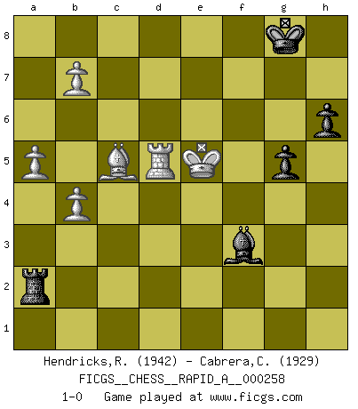 Last move : 1-0 2020 September 4 19:13:46 [Event "FICGS__CHESS__RAPID_A__000258"] [Site "FICGS"] [Date "2020.07.24"] [Round "1"] [White "Hendricks,Richard"] [Black "Cabrera,Claudio"] [Result "1-0"] [WhiteElo "1942"] [BlackElo "1929"] 1.d4 Nf6 2.c4 e6 3.Nc3 Bb4 4.Qc2 O-O 5.a3 Bxc3+ 6.Qxc3 b6 7.Bg5 Bb7 8.f3 h6 9.Bh4 d6 10.e4 Nbd7 11.e5 dxe5 12.dxe5 Ne4 13.Bxd8 Nxc3 14.Bxc7 Rfc8 15.Bd6 Na4 16.Rb1 b5 17.b3 Nab6 18.cxb5 Rc2 19.Ne2 Rac8 20.Nd4 Ra2 21.Be2 Nd5 22.Kf2 f6 23.Rhc1 Nc3 24.Ra1 Rxa1 25.Rxa1 fxe5 26.Nxe6 Nxe2 27.Kxe2 Rc2+ 28.Kd3 Rxg2 29.f4 Bd5 30.Nc5 Nxc5+ 31.Bxc5 exf4 32.Bxa7 Rxh2 33.Kd4 Rd2+ 34.Kc3 Rg2 35.a4 Be6 36.b4 Rg3+ 37.Kd4 f3 38.Bc5 f2 39.Ke5 Ra3 40.Rf1 Bc4 41.Rxf2 Rd3 42.Bd4 Ra3 43.b6 Ba6 44.a5 g5 45.Bc5 Bb7 46.Rd2 Bf3 47.Rd5 Ra2 48.b7 1-0 Nimzo-Indian : Classical variation Kingside Castling by player Black (move 4) Player White won this chess game. Follow this game move after move (download)Let the perfectionist play postal. (Yasser Seirawan) Mutter, ich bin eben Ex-Weltmeister geworden. --beim nach Hause Kommen nach dem Verlust des WM-Titels an Mihail Botvinnik -- (Mikhail Nekhemyevich Tal) Con el fin de mejorar tu juego, debes de estudiar los finales antes que todo, ya que mientras que los finales pueden ser estudiados y dominados por sí mismos, el juegomedio y la apertura deben de ser estudiados en relación con los finales. (José Raúl Capablanca) Une platitude souvent récitée à propos des Echecs est qu'une des choses les plus difficiles à réaliser est de gagner une position gagnante. Cela ne manque pas de sens mais, pour ma part, j'ai toujours trouvé plus difficile de gagner une position perdante. (Tim Krabbe) You lose, general Kenobi. (General Grievous in Star Wars ep.3)