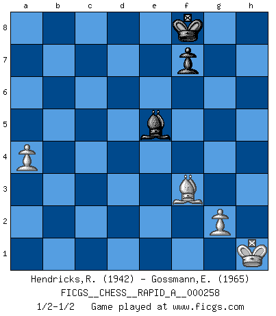 Last move : 1/2-1/2 2020 September 19 20:49:17 [Event "FICGS__CHESS__RAPID_A__000258"] [Site "FICGS"] [Date "2020.07.24"] [Round "1"] [White "Hendricks,Richard"] [Black "Gossmann,Ewald"] [Result "1/2-1/2"] [WhiteElo "1942"] [BlackElo "1965"] 1.d4 Nf6 2.c4 g6 3.Nc3 d5 4.Nf3 Bg7 5.Qb3 dxc4 6.Qxc4 O-O 7.e4 a6 8.Be2 b5 9.Qb3 c5 10.dxc5 Be6 11.Qc2 Nbd7 12.Be3 Rc8 13.Rd1 b4 14.Nd5 Bxd5 15.exd5 Nxc5 16.O-O Nce4 17.Qb3 a5 18.Ne5 Nc5 19.Bxc5 Rxc5 20.Bf3 Qd6 21.Rfe1 Rd8 22.Nd3 R5c8 23.Ne5 Rc5 24.Nc6 Rd7 25.Rc1 Bf8 26.Rxc5 Qxc5 27.Rd1 h5 28.h3 Rd6 29.Qe3 Qxe3 30.fxe3 e6 31.e4 exd5 32.exd5 g5 33.Nxa5 g4 34.Be2 Rxd5 35.Rxd5 Nxd5 36.hxg4 Bc5+ 37.Kh2 Bd6+ 38.Kh1 Nf4 39.Bf3 hxg4 40.Bxg4 Nd3 41.Nc4 Bf4 42.Bf3 Kf8 43.a4 bxa3 44.bxa3 Ne5 45.Nxe5 Bxe5 46.a4 1/2-1/2 King's Indian defense, 3.Nc3 Kingside Castling by player Black (move 6) Kingside Castling by player White (move 16) 10 pieces endgame at move 43 : White KBNPP , Black KBNPP WHITE : King + 1 Bishop 1 Knight 2 Pawns BLACK : King + 1 Bishop 1 Knight 2 Pawns 9 pieces endgame at move 44 : White KBNPP , Black KBNP WHITE : King + 1 Bishop 1 Knight 2 Pawns BLACK : King + 1 Bishop 1 Knight 1 Pawn 8 pieces endgame at move 45 : White KBNPP , Black KBP WHITE : King + 1 Bishop 1 Knight 2 Pawns BLACK : King + 1 Bishop 1 Pawn 7 pieces endgame at move 45 : White KBPP , Black KBP WHITE : King + 1 Bishop 2 Pawns BLACK : King + 1 Bishop 1 Pawn This chess game ended in a draw. Follow this game move after move (download)Avoid the crowd. Do your own thinking independently. Be the Chess player, not the Chess piece. (Ralph Charell) Die meiste Zeit treffe ich auf Gegner, die meine Enkel sein könnten. Ich bin da, um ihnen zu zeigen, dass sie von mir noch einiges lernen können. (Viktor Kortschnoi) En posiciones complicadas, Bobby Fischer pocas veces tuvo que temer de cualquiera. (Paul Keres) Le temps de noter son nom sur la feuille de partie, j'étais déjà en zeitnot ! D'un modeste amateur apparié lors de la première ronde d'un open contre le grand-maître Azmaïparashvili. I don't diet. I just don't eat as much as I'd like to. (Linda Evangelista, supermodel)