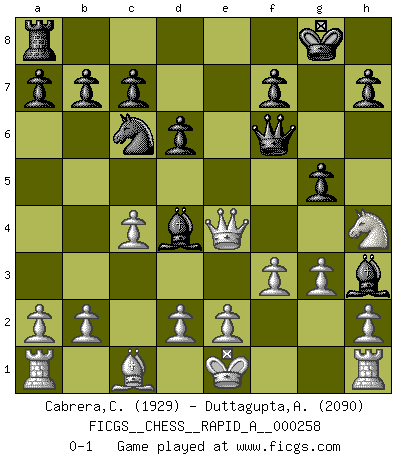 Last move : 0-1 2020 August 25 23:28:1 [Event "FICGS__CHESS__RAPID_A__000258"] [Site "FICGS"] [Date "2020.07.24"] [Round "1"] [White "Cabrera,Claudio"] [Black "Duttagupta,Aniruddha"] [Result "0-1"] [WhiteElo "1929"] [BlackElo "2090"] 1.c4 Nf6 2.Nc3 e5 3.Nf3 Nc6 4.g3 Bb4 5.Nd5 e4 6.Nh4 O-O 7.Bg2 d6 8.Nxf6+ Qxf6 9.Bxe4 Re8 10.f3 Bh3 11.Qb3 Bc5 12.Qc3 Bd4 13.Qd3 Rxe4 14.Qxe4 g5 0-1 English Opening Kingside Castling by player Black (move 6) Player Black won this chess game. Follow this game move after move (download)Nonsense was the last thing Fischer was interested in, as far as Chess was concerned. (Elie Agur) Schach ist wie eine schöne Frau, zu der wir ständig zurückkehren, gleichviel, wie oft sie uns zurückweist. (Anonymous) Bobby solo arroja las piezas y solas caen en las casillas correctas. (Miguel Najdorf ) Les Echecs sont et restent toujours un combat, un combat intégral comme la boxe, la lutte ou un autre sport, et où il doit y avoir un vainqueur et un vaincu. (Joseph Emil Diemer) Depression is just anger without enthusiasm. (Unknown)