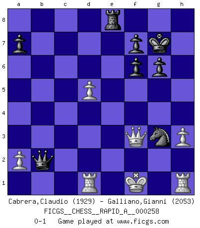 Last move : 0-1 2020 August 14 21:47:34 [Event "FICGS__CHESS__RAPID_A__000258"] [Site "FICGS"] [Date "2020.07.24"] [Round "1"] [White "Cabrera,Claudio"] [Black "Galliano,Gianni"] [Result "0-1"] [WhiteElo "1929"] [BlackElo "2053"] 1.Nf3 c5 2.c4 Nf6 3.Nc3 Nc6 4.g3 g6 5.Bg2 Bg7 6.O-O d6 7.d4 cxd4 8.Nxd4 Bd7 9.Nc2 Qc8 10.Bg5 h5 11.Qd2 Bh3 12.Bxf6 Bxf6 13.Nd5 h4 14.Nxf6+ exf6 15.Qxd6 hxg3 16.Qxg3 Bxg2 17.Kxg2 Qe6 18.Ne3 Nd4 19.Nd5 Kf8 20.b3 Nxe2 21.Qf3 Nd4 22.Qd3 Qg4+ 23.Qg3 Qf5 24.h3 Rh5 25.f4 Kg7 26.Rae1 Rah8 27.Rh1 b5 28.Qc3 Ne6 29.Ref1 bxc4 30.bxc4 Qe4+ 31.Kf2 Rxd5 32.cxd5 Nxf4 33.Qf3 Qd4+ 34.Kg3 Nh5+ 35.Kg2 Re8 36.Rd1 Qb2+ 37.Kf1 Ng3+ 0-1 Reti Opening Kingside Castling by player White (move 6) Player Black won this chess game. Follow this game move after move (download)All I want to do, ever, is just play Chess. (Bobby Fischer) Fischer ist das größte Genie, das je vom Schachhimmel heruntergestiegen ist. (Mikhail Nekhemyevich Tal) El Ajedrez es un mar en el cual un mosquito puede beber y un elefante puede bañarse. (Refrán Hindú) Toute estimation doit être constamment réévaluée. (Jacob Estrin) There is far too much law for those who can afford it and far too little for those who cannot. (Derek Bok)
