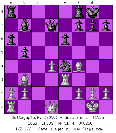 Last move : 1/2-1/2 2020 September 11 16:16:35 [Event "FICGS__CHESS__RAPID_A__000258"] [Site "FICGS"] [Date "2020.07.24"] [Round "1"] [White "Duttagupta,Aniruddha"] [Black "Gossmann,Ewald"] [Result "1/2-1/2"] [WhiteElo "2090"] [BlackElo "1965"] 1.e4 e6 2.d4 d5 3.Nd2 c5 4.exd5 Qxd5 5.Ngf3 cxd4 6.Bc4 Qd7 7.O-O Nf6 8.Nb3 Nc6 9.Nbxd4 Nxd4 10.Nxd4 a6 11.Re1 b5 12.Bb3 Bb7 13.Bg5 Ne4 14.Bf4 Bc5 15.c3 O-O 16.Re3 Bxd4 17.cxd4 Nf6 18.Rg3 Ne4 19.Re3 Nf6 20.Rg3 Ne4 21.Re3 1/2-1/2 French : Tarrasch, Open variation Kingside Castling by player White (move 7) Kingside Castling by player Black (move 15) This chess game ended in a draw. Follow this game move after move (download)Chess makes man wiser and clear-sighted. (Vladimir Putin) Auf jeden Fall musst du zuerst Rechtsanwalt werden, damit du deine eigenen Interessen und die deiner Familie vertreten kannst. [Brief an seinen Sohn] (José Raúl Capablanca) Yo no le temo a Spassky. Todos saben que yo soy el mejor. Uno no necesita un torneo para probarlo. (Bobby Fischer) La victoire dans une partie d'Echecs appartient la plupart du temps à celui qui voit un peu plus loin que l'adversaire. (Lasker) Now be brave and don't look back. Don't look back. (Shmi Skywalker in Star Wars ep.1)