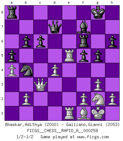 Last move : 1/2-1/2 2020 September 19 11:6:40 [Event "FICGS__CHESS__RAPID_A__000258"] [Site "FICGS"] [Date "2020.07.24"] [Round "1"] [White "Bhaskar,Adithya"] [Black "Galliano,Gianni"] [Result "1/2-1/2"] [WhiteElo "2000"] [BlackElo "2053"] 1.d4 Nf6 2.c4 e6 3.Nf3 d5 4.g3 dxc4 5.Bg2 Bb4+ 6.Bd2 a5 7.Qc2 Bxd2+ 8.Qxd2 c6 9.a4 Ne4 10.Qc2 Nd6 11.O-O Na6 12.Nbd2 Nb4 13.Qc1 O-O 14.Ne5 Qc7 15.Ndxc4 f6 16.Nf3 Rd8 17.Nxd6 Rxd6 18.e4 b6 19.Bh3 f5 20.exf5 exf5 21.Re1 Be6 22.Qc3 Bd5 23.Re5 Rf6 24.Nh4 g6 25.Ng2 Bf7 26.Nf4 h6 27.Rae1 Qd7 28.Bf1 g5 29.Ng2 1/2-1/2 Queen's pawn game Kingside Castling by player White (move 11) Kingside Castling by player Black (move 13) This chess game ended in a draw. Follow this game move after move (download)If you aren't afraid of Spassky, then I have removed the element of money. (Jim Slater) Schach verlangt totale Konzentration. (Robert James Fischer) No volvere nunca a jugar contigo. Has insultado a mi amigo. - cuando un oponente se maldijo por una mala jugada (Miguel Najdorf) Le jeu d'échecs fait naître et fortifie en nous plusieurs qualités précieuses dans le cours de l'existence, telles que la prévoyance, la circonspection, la prudence, et la persévérance. (Benjamin Franklin - 1783, la morale des échecs) Faith : not wanting to know what is true. (Friedrich Nietzsche)