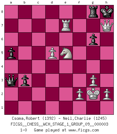 Last move : 1-0 2007 October 24 22:6:30 [Event "FICGS__CHESS__WCH_STAGE_1_GROUP_09__000003"] [Site "FICGS"] [Date "2007.07.11"] [Round "1"] [White "Csoma,Robert"] [Black "Neil,Charlie"] [Result "1-0"] [WhiteElo "1392"] [BlackElo "1245"] 1.Nf3 Nf6 2.g3 g6 3.Bg2 Bg7 4.O-O O-O 5.d3 c5 6.e4 Nc6 7.c3 d6 8.Nbd2 Bd7 9.d4 cxd4 10.cxd4 Re8 11.d5 Nb4 12.Qb3 a5 13.a3 Na6 14.Re1 Nc5 15.Qd1 Nd3 16.Re3 Nxc1 17.Rxc1 Rc8 18.Rxc8 Qxc8 19.Rc3 Qd8 20.Rc2 Qb6 21.Nc4 Qb3 22.Nfd2 Qb5 23.e5 dxe5 24.Nxe5 Bf5 25.Rc4 Qxb2 26.Ndf3 Qxa3 27.Rc7 Be4 28.Ng5 Bxg2 29.Kxg2 b5 30.Ngxf7 Ng4 31.Qxg4 Bxe5 32.Nxe5 b4 33.Qe6+ Kh8 34.Qf7 Rg8 35.Rxe7 b3 36.Qxh7+ 1-0 Reti : King's Indian attack Kingside Castling by player White (move 4) Kingside Castling by player Black (move 4) Player White won this chess game. Follow this game move after move (download)The enormous mental resilience, without which no Chess player can exist, was so much taken up by Chess that he could never free his mind of this game. (Albert Einstein) Kostenjuk hat keinen Sexappeal. (Loek van Wely) Debió haber existido una vez en que los hombres eran semidióses, de otra manera no hubiesen podido inventar el Ajedrez. (Gustav Schenk) La conception d'un plan est le processus par lequel un joueur exploite les avantages de sa position tout en s'efforçant d'en réduire au minimum les inconvénients. Afin de garantir le succès, un plan doit toujours se fonder sur un diagnostic objectif des particularités d'une position. La conception d'un plan est d'autant plus difficile que la position est équilibrée, et grandement facilitée lorsqu'il n'existe qu'un seul plan susceptible de répondre aux exigences de la position. (Harry Golombek) They misunderestimated me. (George W. Bush, Bentonville nov. 6, 2000)