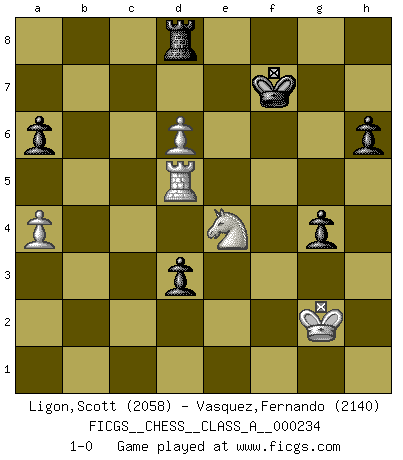 Last move : 1-0 2021 February 11 21:43:3 [Event "FICGS__CHESS__CLASS_A__000234"] [Site "FICGS"] [Date "2020.07.25"] [Round "1"] [White "Ligon,Scott"] [Black "Vasquez,Fernando"] [Result "1-0"] [WhiteElo "2058"] [BlackElo "2140"] 1.e4 e5 2.Nc3 Nf6 3.g3 Bc5 4.Bg2 O-O 5.Nge2 Nc6 6.Na4 Be7 7.Nac3 Nd4 8.O-O c5 9.a4 d6 10.d3 Bg4 11.h3 Bd7 12.f4 Rc8 13.Kh2 h6 14.Nb1 Re8 15.Bd2 Qc7 16.c4 Nc6 17.Nbc3 Nb4 18.Be3 Nc6 19.b3 a6 20.Bd2 Nb4 21.g4 exf4 22.Bxf4 Nh7 23.Nd5 Nxd5 24.exd5 Bf6 25.Ra2 Be5 26.Ng3 Re7 27.Bxe5 Rxe5 28.Raf2 f6 29.Be4 b5 30.h4 Qd8 31.g5 fxg5 32.Bxh7+ Kxh7 33.d4 cxd4 34.Qd3+ Kh8 35.Qg6 g4 36.Kg1 bxc4 37.Ne4 Bf5 38.Rxf5 Rxf5 39.Qxf5 Rb8 40.bxc4 Qxh4 41.Qf4 Qh3 42.c5 g3 43.Qxg3 Qxg3+ 44.Nxg3 dxc5 45.d6 Rd8 46.Ne4 g5 47.Rc1 Kg7 48.Rxc5 Kf7 49.Ra5 g4 50.Kg2 d3 51.Rd5 1-0 Follow this game move after move (download)All that matters on the Chessboard is good moves. (Bobby Fischer) Je mehr ich von der FIDE weiss, um so weniger verstehe ich. (Alexander Kalifman) El Peón aislado arroja penumbra sobre todo el tablero. (Aaron Nimzovich) Les écrivains ont utilisé les échecs pour analyser les côtés extrêmes de la nature humaine. Dans ce cadre, les échecs offrent un champ d'expérimentation idéal. Mais on pourrait faire la même chose avec la peinture. Et là, en vous référant à Van Gogh, vous ne tirerez pas de conclusion définitive sur les peintres. (Gary Kasparov) Life is verb, not a noun. (Charlotte Perkins Gilman)