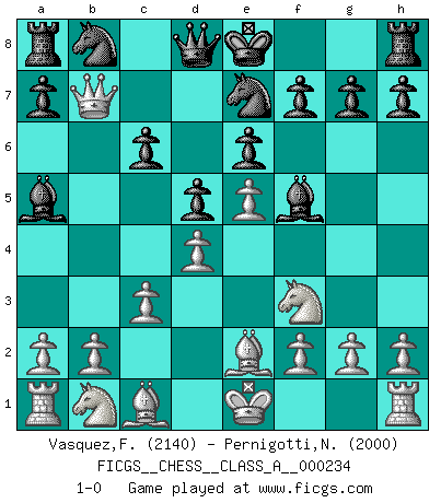 Last move : 1-0 2020 October 2 12:53:17 [Event "FICGS__CHESS__CLASS_A__000234"] [Site "FICGS"] [Date "2020.07.25"] [Round "1"] [White "Vasquez,Fernando"] [Black "Pernigotti,Nicolas"] [Result "1-0"] [WhiteElo "2140"] [BlackElo "2000"] 1.e4 c6 2.d4 d5 3.e5 Bf5 4.Nf3 e6 5.Be2 Bb4+ 6.c3 Ba5 7.Qb3 Ne7 8.Qxb7 1-0 This chess game has been lost on time (started : 2020.07.25 17:13:16) Caro-Kann : Advance variation Player White won this chess game. Follow this game move after move (download)My style is somewhere between that of Tal and Petrosian. (Reshevsky) Moralische Siege zählen nicht. (Savielly Grigorievitsch Tartakower) Tu cuerpo tiene que estar en óptima condición. Tu Ajedrez se deteriora como lo hace tu cuerpo. No puedes separar la mente y el cuerpo. (Bobby Fischer) Les ravages du H expliquent la différence de niveau entre Tal et Thal [Abergel]. Wisdom is the reward you get for a lifetime of listening when you'd have preferred to talk. (Doug Larson)