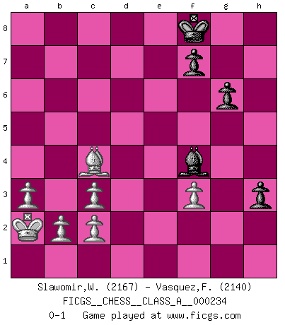 Last move : 0-1 2021 March 31 12:17:49 [Event "FICGS__CHESS__CLASS_A__000234"] [Site "FICGS"] [Date "2020.07.25"] [Round "1"] [White "Slawomir,Weglicki"] [Black "Vasquez,Fernando"] [Result "0-1"] [WhiteElo "2167"] [BlackElo "2140"] 1.e4 e5 2.Nf3 Nf6 3.Nxe5 d6 4.Nf3 Nxe4 5.Nc3 Nxc3 6.dxc3 Be7 7.Be3 O-O 8.Qd2 Nd7 9.O-O-O Re8 10.Kb1 Nf6 11.Bd3 a6 12.Bd4 c5 13.Bxf6 Bxf6 14.Bc4 Rb8 15.Rhe1 b5 16.Qxd6 Bb7 17.Qxd8 Rexd8 18.Be2 Rxd1+ 19.Rxd1 Re8 20.Bf1 Bxf3 21.gxf3 c4 22.a3 g6 23.Bh3 Bh4 24.Bd7 Rd8 25.Rd5 Bxf2 26.Bc6 Rb8 27.Rd7 Rb6 28.Bd5 Rf6 29.Ka2 Be3 30.Re7 Bc1 31.Ra7 Kf8 32.Bb7 Be3 33.Rxa6 Rf5 34.Bc6 Rh5 35.Ra5 Rxh2 36.Rxb5 h5 37.Bd5 Rh4 38.Rb4 Rf4 39.Rxc4 h4 40.Rxf4 Bxf4 41.Bc4 h3 0-1 Follow this game move after move (download)Alekhine is a poet who creates a work of art out of something that would hardly inspire another man to send home a picture post card. (Max Euwe) Es ist peinlich, dass ich nie Weltmeister wurde. Es wäre leicht, Leonid Breschnjew als Ursache vorzuschieben, dessen Apparat den Vorzeigekommunisten Anatoli Karpow in allem unterstützte. Aber Garri Kasparow zum Beispiel, der ebenfalls von den Sowjets unerwünscht war, hat trotz der Widerstände den WM-Titel erobert. (Viktor Kortschnoi) Si no le temes a Spassky, entonces elimino el elemento del dinero. (Jim Slater) Le profane ne songe pas à la somme de jouissance dont il se prive, qui méconnaît ce jeu aux ressources aussi variées que passionnantes. (Jean-Marie Jeanton-Lamarche) I just play for fun. (Anna Kournikova)