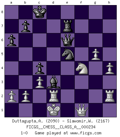 Last move : 1-0 2021 March 27 3:54:47 [Event "FICGS__CHESS__CLASS_A__000234"] [Site "FICGS"] [Date "2020.07.25"] [Round "1"] [White "Duttagupta,Aniruddha"] [Black "Slawomir,Weglicki"] [Result "1-0"] [WhiteElo "2090"] [BlackElo "2167"] 1.e4 Nc6 2.d4 d5 3.e5 Bf5 4.c3 e6 5.Nd2 a6 6.h4 h5 7.Be2 Qd7 8.Bxh5 O-O-O 9.Be2 f6 10.g4 Bh7 11.f4 Be7 12.g5 Na5 13.Nb3 Nc4 14.Bd3 Be4 15.Rh3 c5 16.exf6 gxf6 17.Nxc5 Bxc5 18.dxc5 Qb5 19.Bf1 Qxc5 20.Qd4 Qc7 21.Bxc4 e5 22.fxe5 fxe5 23.Bf4 exf4 24.Qxh8 dxc4 25.Rd1 Bd3 26.Qh5 Qe7+ 27.Ne2 Qe6 28.Rh2 Ne7 29.Qf3 Ng6 30.Rd2 Rd7 31.Qf1 Re7 32.Kd1 Ne5 33.Nxf4 1-0 Follow this game move after move (download)The Chess pieces are the block alphabet which shapes thoughts; and these thoughts, although making a visual design on the chessboard, express their beauty abstractly, like a poem. (Marcel Duchamp) Ja, ich habe einmal eine Blitzpartie gespielt, es war in einem Zug, 1929. --im Interview 1989 (Mikhail Moiseyevich Botvinik) Yo no creo en la psicología. Yo creo en las buenas movidas. (Bobby Fischer) On entre au jeu d'Echecs comme on entre en Religion. Pour le joueur d'Echecs, la partie d'Echecs c'est l'office, la messe, le défilé du 1er Mai, le dépôt de gerbe au Monument aux Morts. C'est un drame sacré. (Michel Roos) Optimism is a variety of information deficit. Sometimes especially true for correspondence chess games. (Michael Aigner)
