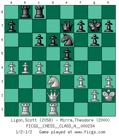 Last move : 1/2-1/2 2020 August 3 23:38:27 [Event "FICGS__CHESS__CLASS_A__000234"] [Site "FICGS"] [Date "2020.07.25"] [Round "1"] [White "Ligon,Scott"] [Black "Mirra,Theodore"] [Result "1/2-1/2"] [WhiteElo "2058"] [BlackElo "2000"] 1.e4 c5 2.Nf3 d6 3.Bb5+ Bd7 4.Bxd7+ Qxd7 5.c4 Nf6 6.Nc3 g6 7.d4 cxd4 8.Nxd4 Bg7 9.h3 Qc7 10.b3 Nc6 11.Bb2 Qb6 12.Nxc6 bxc6 13.O-O O-O 14.Na4 Qc7 15.Re1 Nh5 16.Qd2 Rad8 17.Rad1 Bxb2 18.Nxb2 e5 19.b4 Ng7 20.Nd3 Ne6 21.a4 Kg7 22.Rb1 Rb8 23.Red1 Rfc8 24.Kh2 Qe7 25.f3 1/2-1/2 Sicilian : Canal-Sokolsky attack, Sokolsky variation Kingside Castling by player White (move 13) Kingside Castling by player Black (move 13) This chess game ended in a draw. Follow this game move after move (download)Your body has to be in top condition. Your Chess deteriorates as your body does. You can't separate body from mind. (Bobby Fischer) Konzentriere dich auf materielle Gewinne. Nimm, was dir dein Gegner gibt, ausser es gibt einen guten Grund der dagegenspricht. (Robert James Fischer) Mis oponentes también hacen buenas movidas. A veces yo no tomo esas cosas en consideración. (Bobby Fischer) Vous savez, camarade Pachman, je n'éprouve pas de plaisir à être ministre, je jouerais plutôt aux échecs comme vous, ou alors ferais une révolution au Venezuela. (Che Guevara à Ludek Pachman, 'Checkmate in Prague', 1975) To send light into the darkness of men's hearts - such is the duty of the artist. (Schumann)