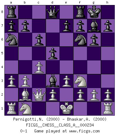Last move : 0-1 2020 September 20 4:43:1 [Event "FICGS__CHESS__CLASS_A__000234"] [Site "FICGS"] [Date "2020.07.25"] [Round "1"] [White "Pernigotti,Nicolas"] [Black "Bhaskar,Adithya"] [Result "0-1"] [WhiteElo "2000"] [BlackElo "2000"] 1.Nf3 d5 2.c4 c6 3.e3 Nf6 4.Qc2 g6 5.b3 Bg7 6.Bb2 O-O 7.Be2 Na6 8.a3 Bf5 9.Bd3 Bxd3 0-1 This chess game has been lost on time (started : 2020.07.25 17:13:16) Reti Opening Kingside Castling by player Black (move 6) Player Black won this chess game. Follow this game move after move (download)Is Bobby Fischer quite sane ? (Salo Flohr) Stil? Ich habe keinen Stil! (Anatoly Karpov) Si yo gano un torneo, yo lo gano por mí mismo. Yo hago las jugadas. Nadie me ayuda. (Bobby Fischer) La victoire dans une partie d'Echecs appartient la plupart du temps à celui qui voit un peu plus loin que l'adversaire. (Lasker) No, no, you're not thinking; you're just being logical. (Niels Bohr)